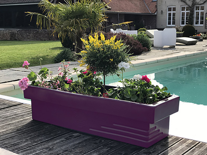 Capacité : 70L. Longueur : 125 cm_Hauteur : 31 cm_ Largeur : 46 cm._Poids : 12 kg_ Pour plantation fleurs et aromates_ Matière : polyéthylène haute densité _Très résistant aux chocs. plage d'utilisation : -30°C à +60°C_ 100% recyclable_Traité anti UV_Marque : PLAST'UP ROTOMOULAGE_Fabrication Française
