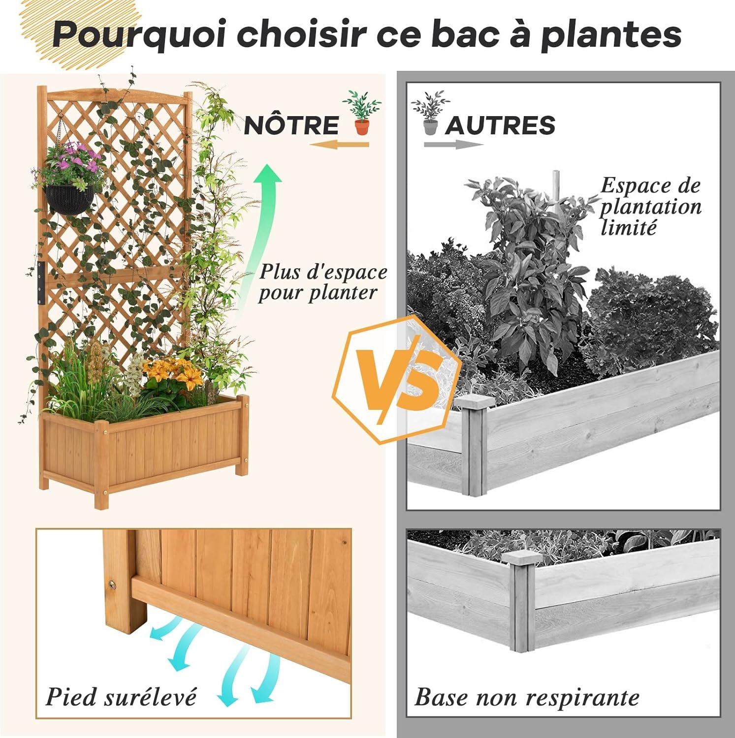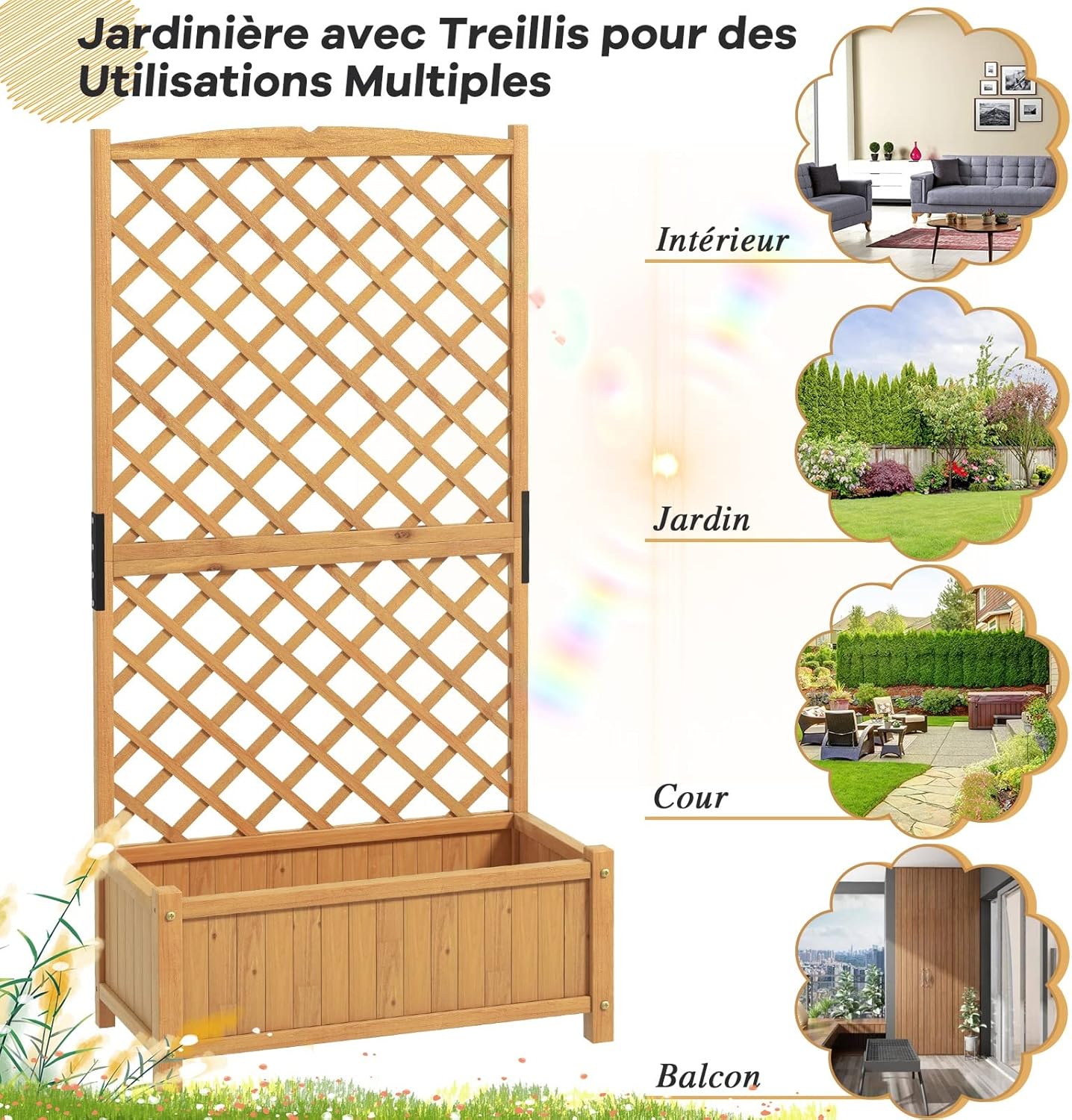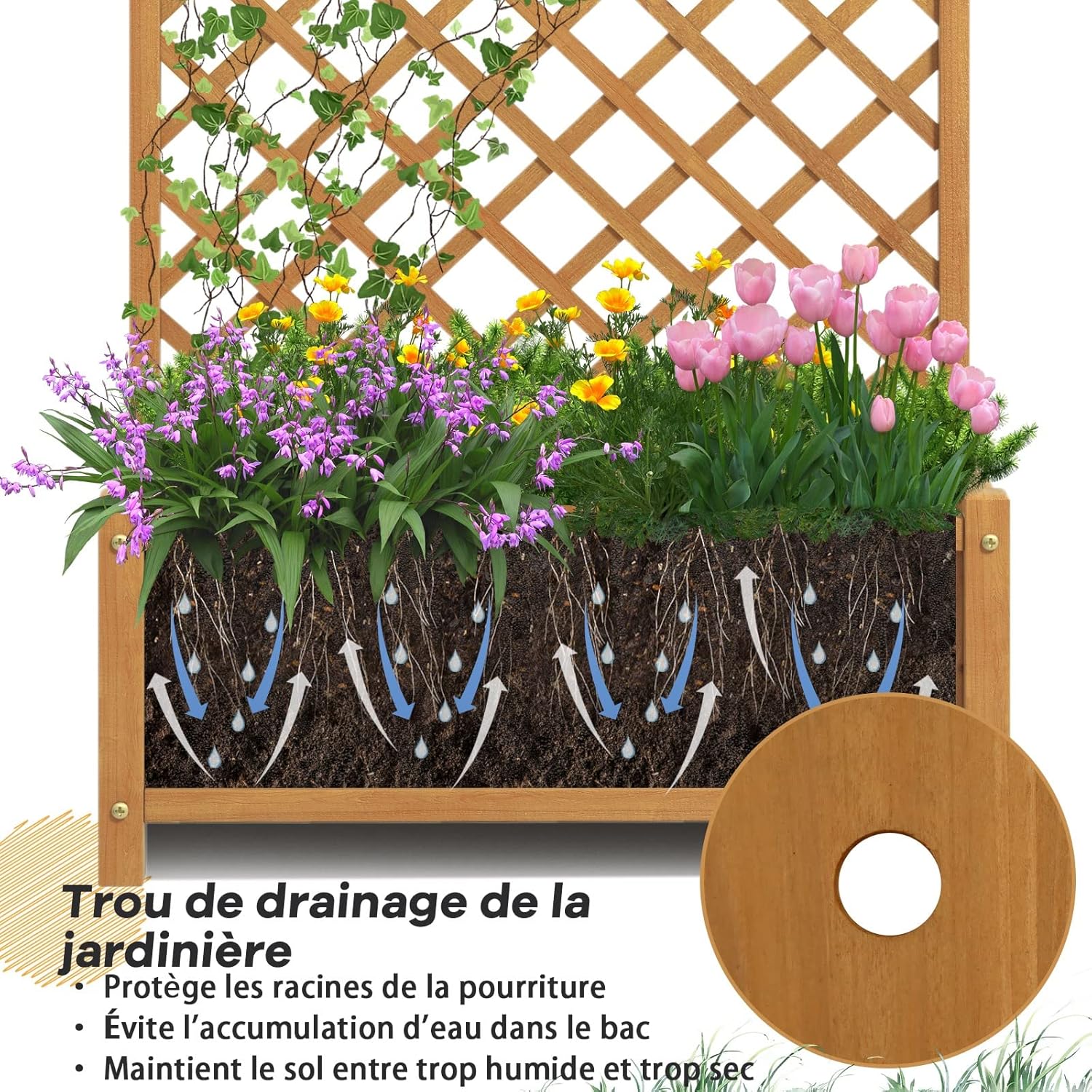 | Libellé | Jardinière avec treillis en bois, 4 trou de drainage pour plantes grimpantes, fleurs, bac à fleurs jaune |
