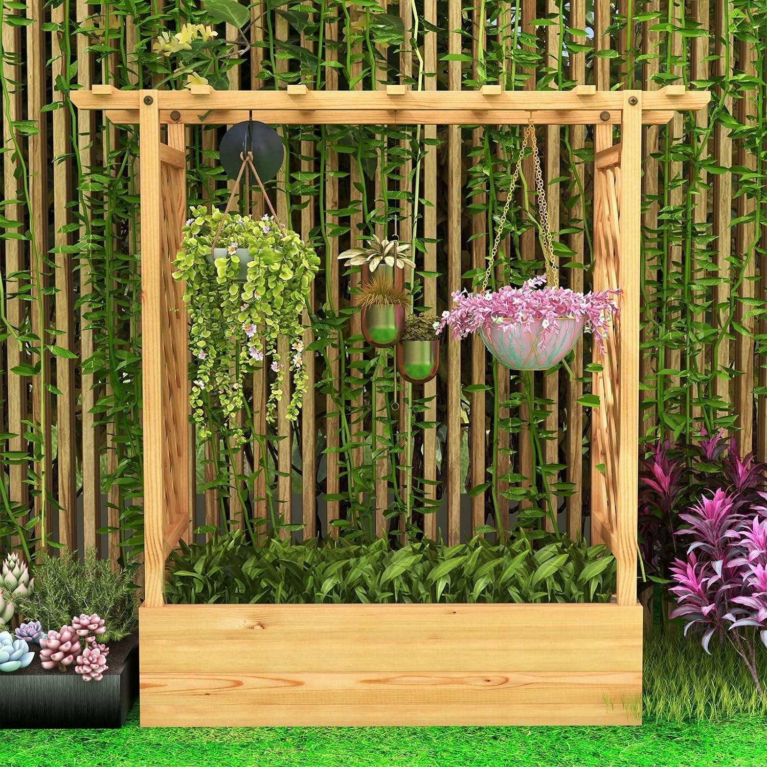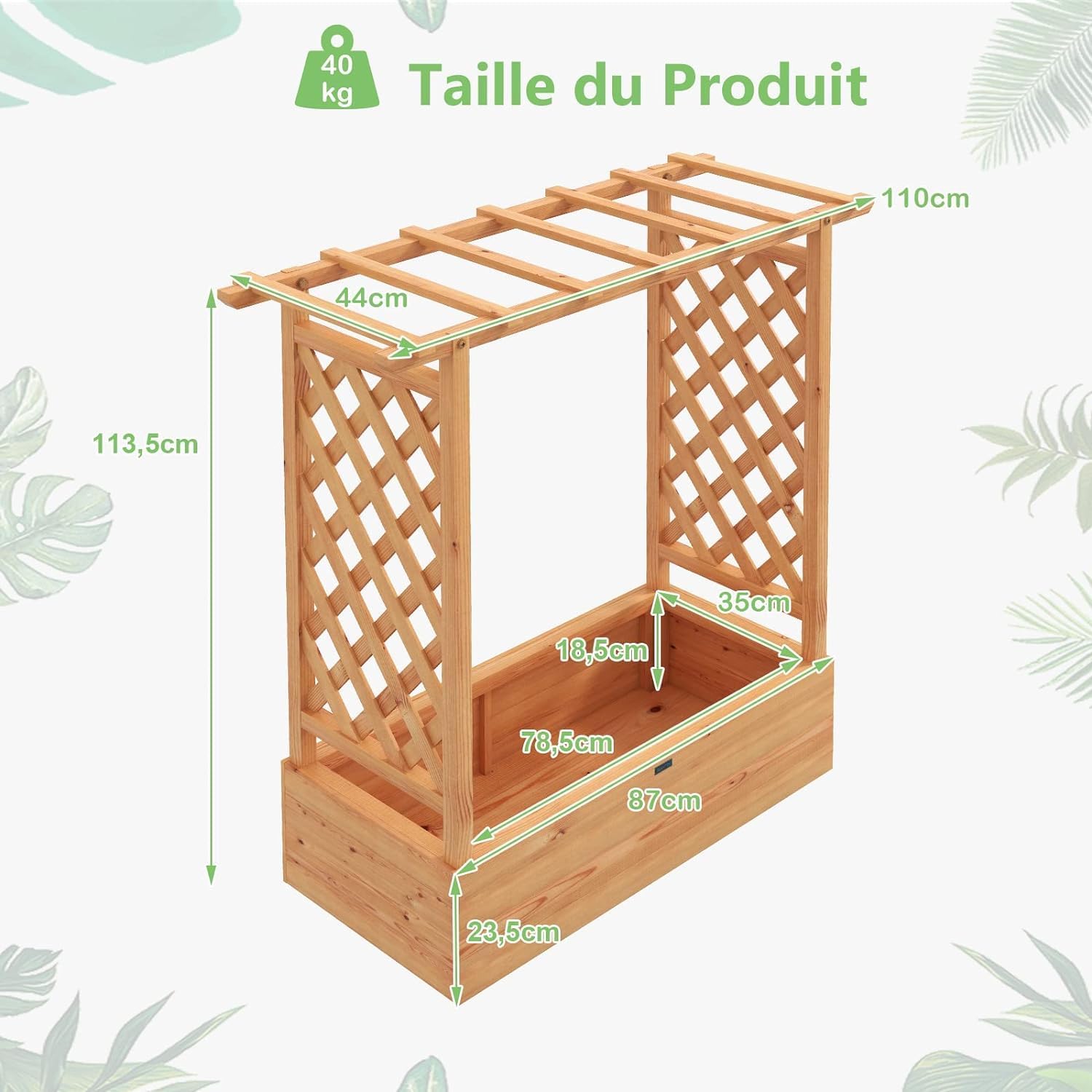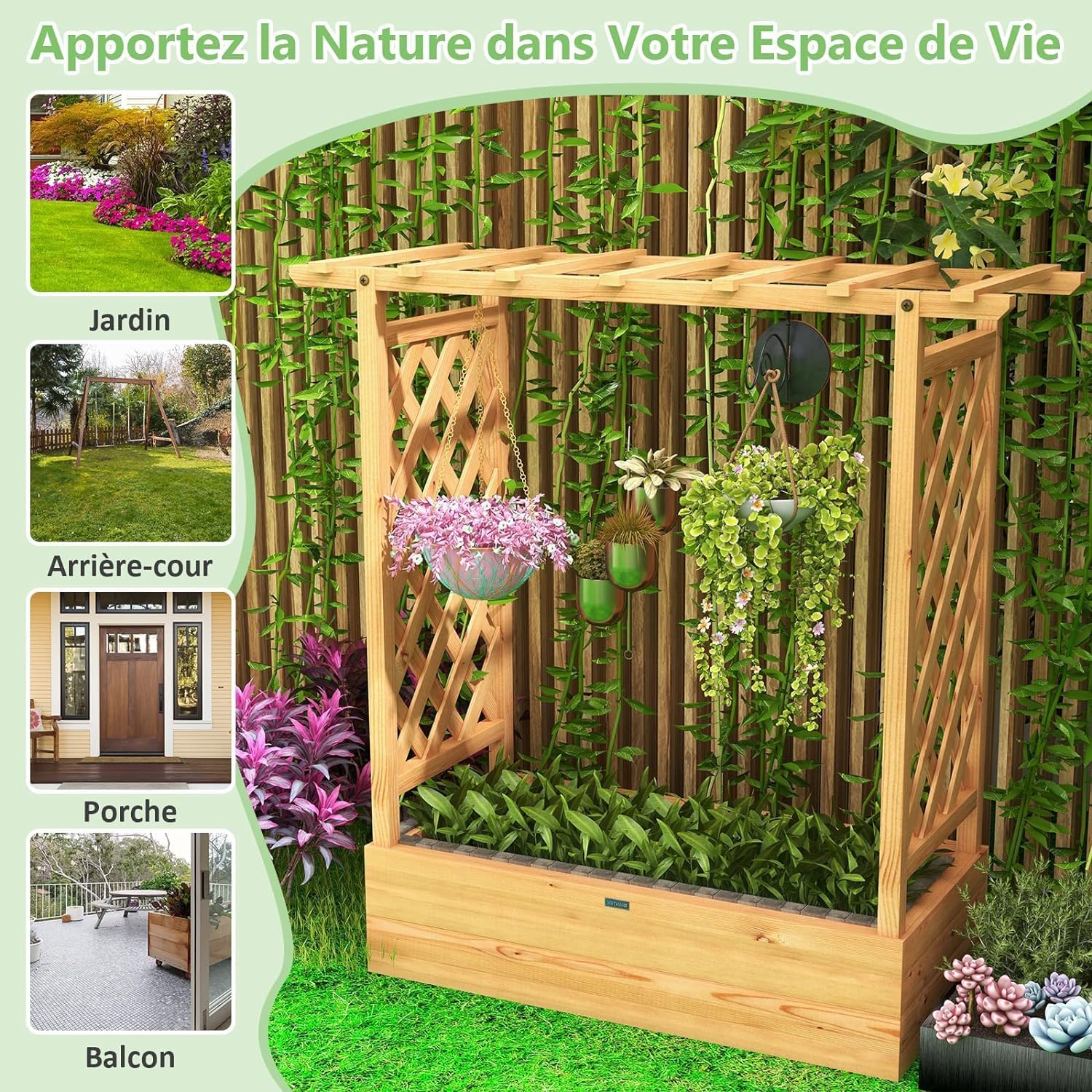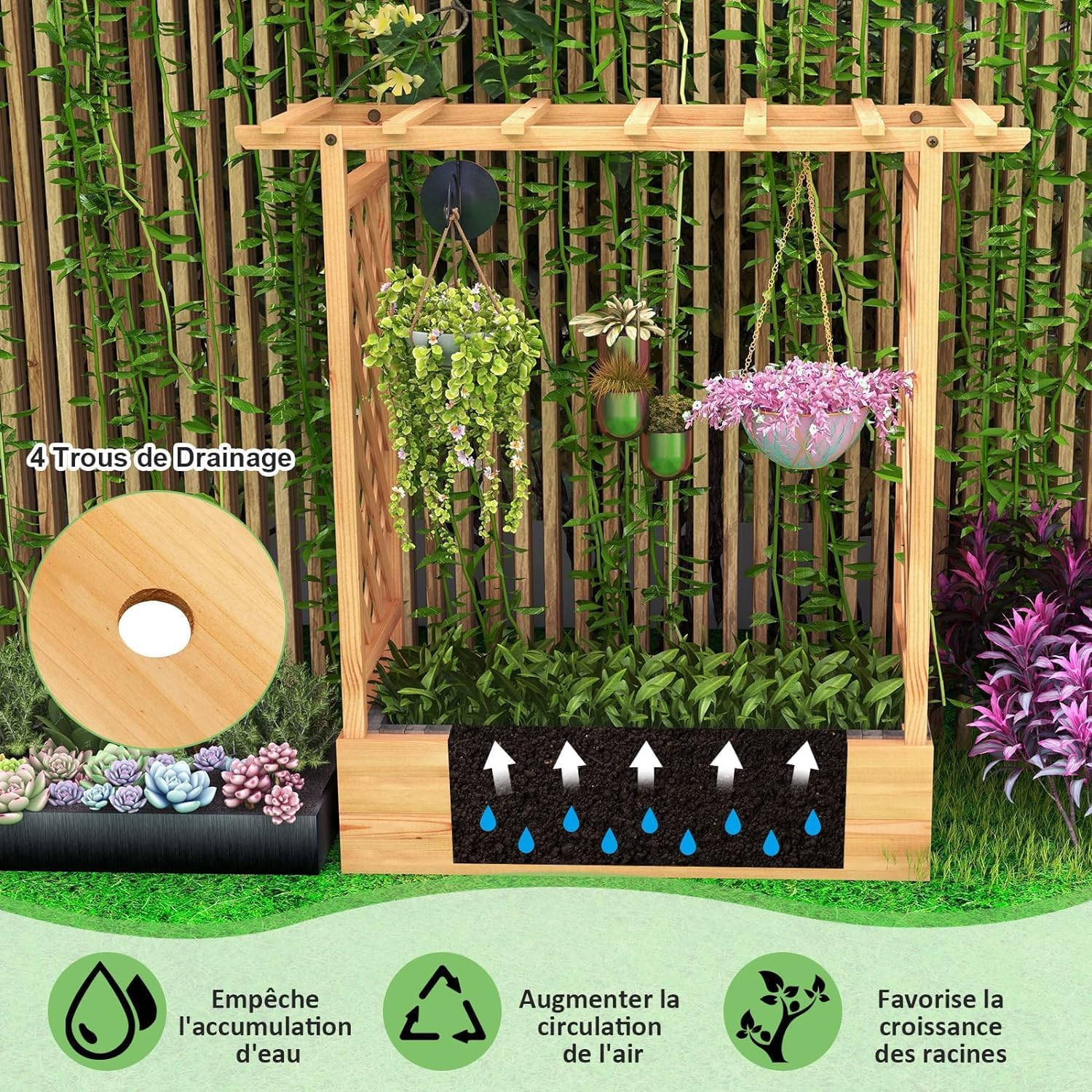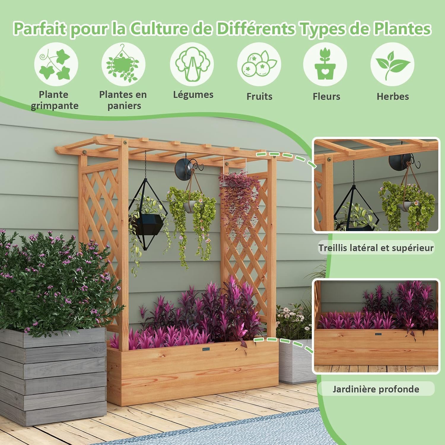- Treillis Facile à Monter : Conçu avec un treillis à deux côtés et un treillis croisé sur le dessus, ce lit de jardin surélevé offre un grand espace pour la croissance des plantes grimpantes. À l'aide d'un treillis multifonctionnel, vous pouvez non seulement planter des plantes ordinaires, mais également y accrocher le panier de plantes.