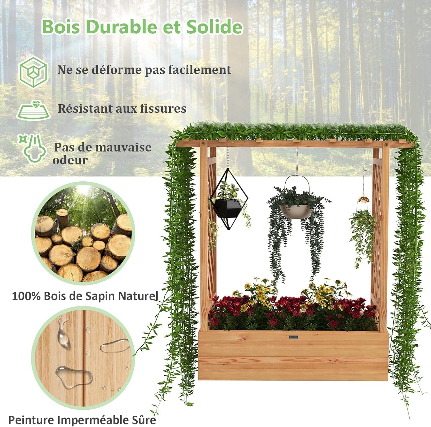- Matériau Robuste : La construction solide du cadre de la jardinière est soigneusement fabriquée avec du bois de sapin de qualité qui présente une bonne résistance à la déformation. De plus, la jardinière est recouverte d'une peinture imperméable, de sorte qu'elle peut être exposée à l'environnement extérieur.