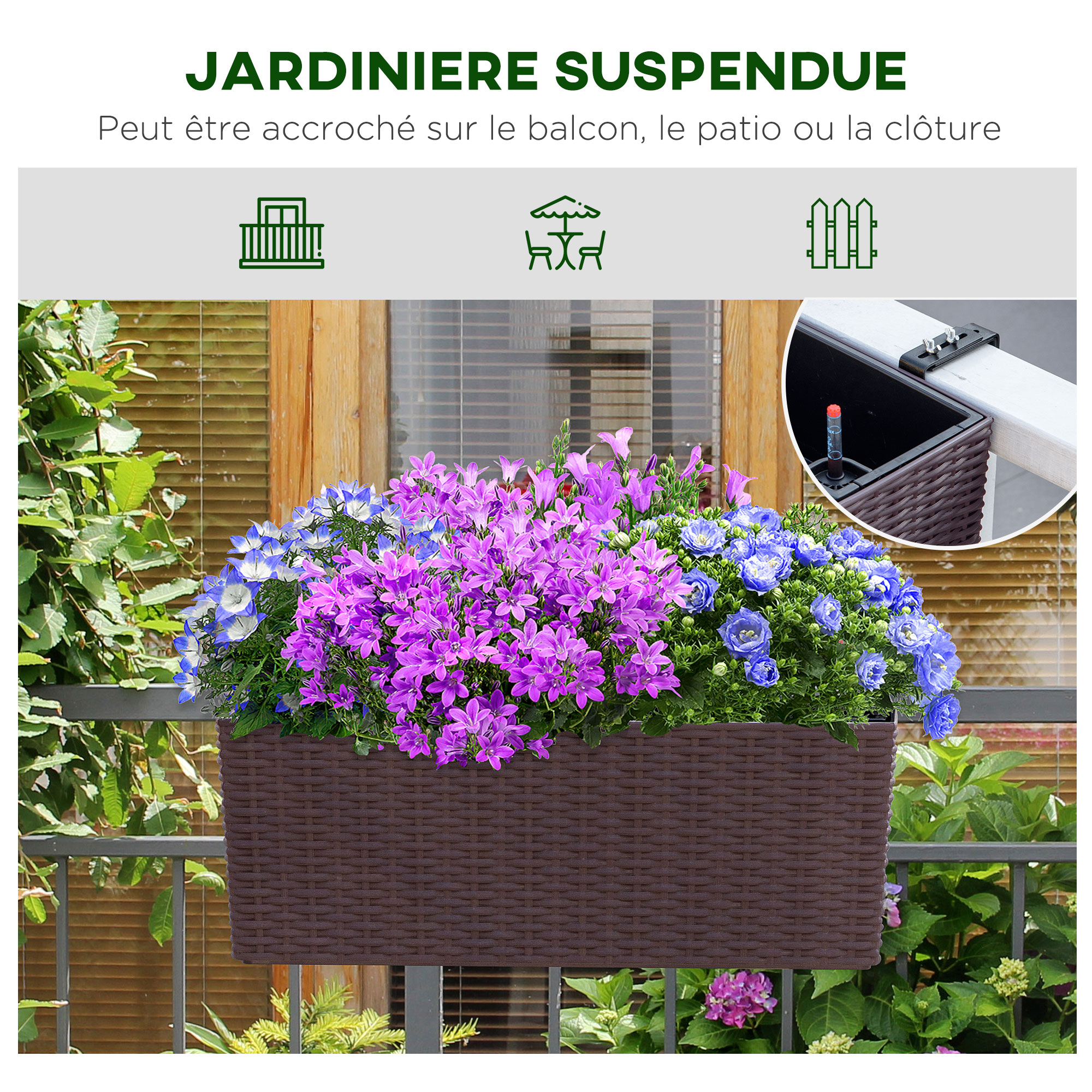Jardinière de balcon - balconnière suspendue - supports de fixation réglables, indicateur niveau d'eau et