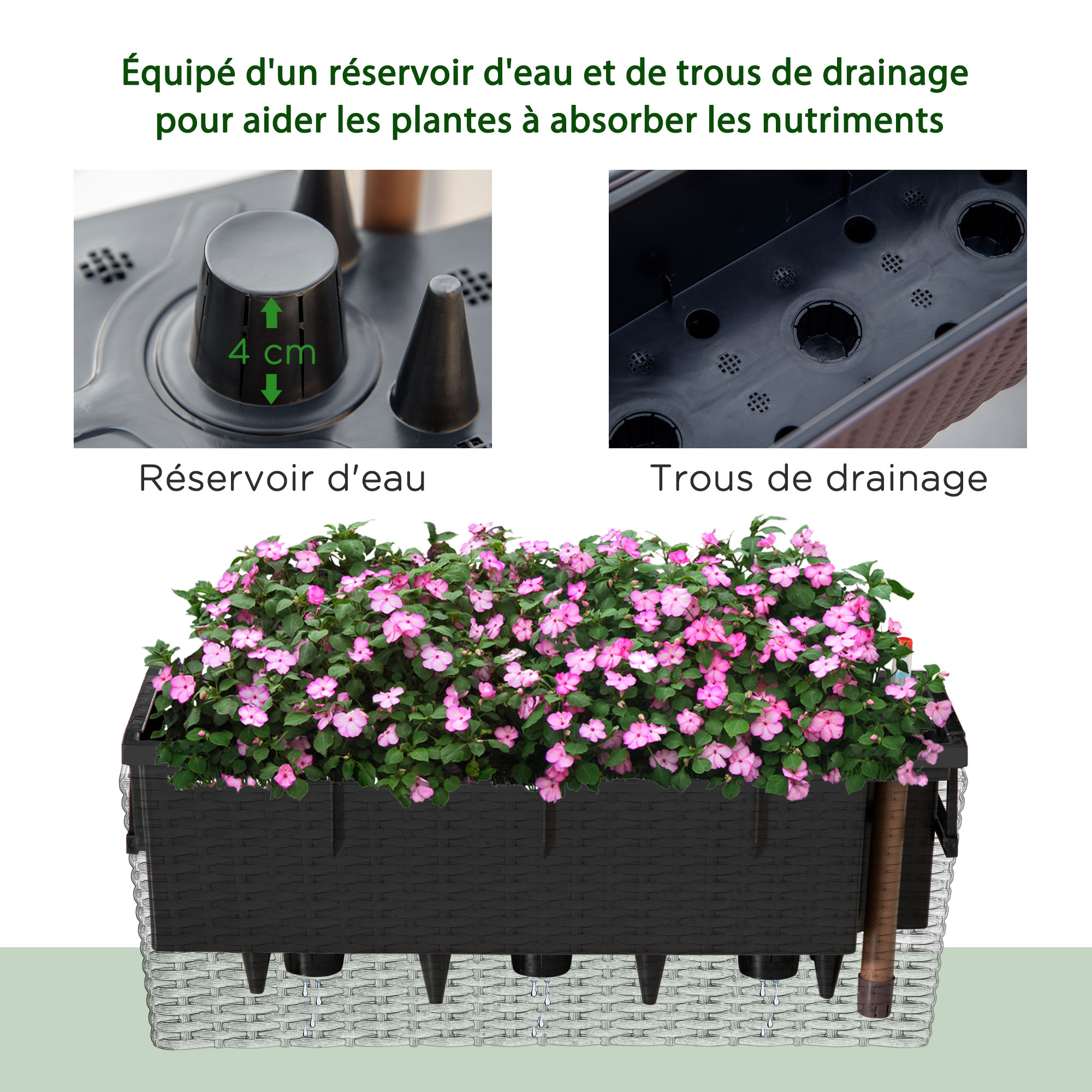 - Comporte une réserve d'eau qui est restituée aux racines de vos plantes par capillarité