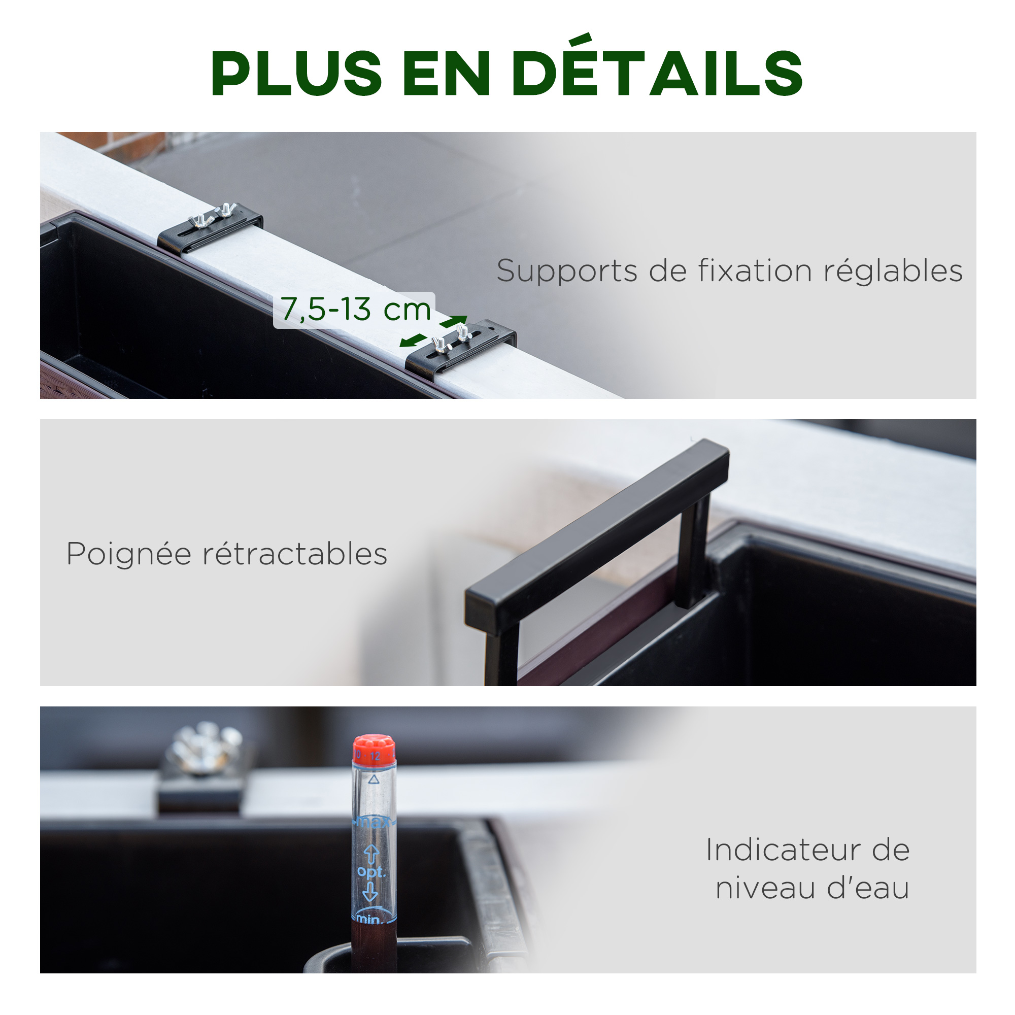 - Jardinière robuste : charge max. recommandée de 20 Kg