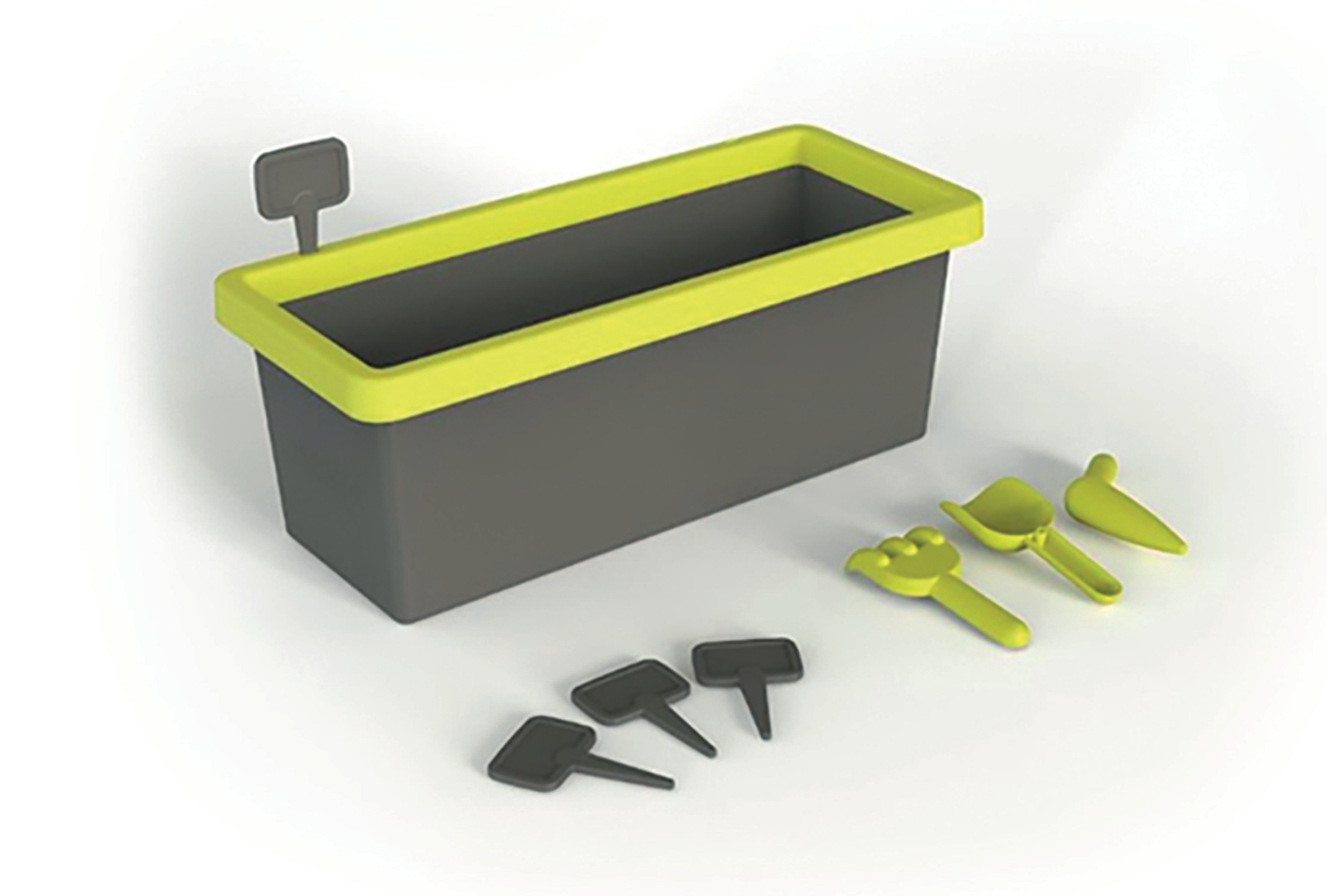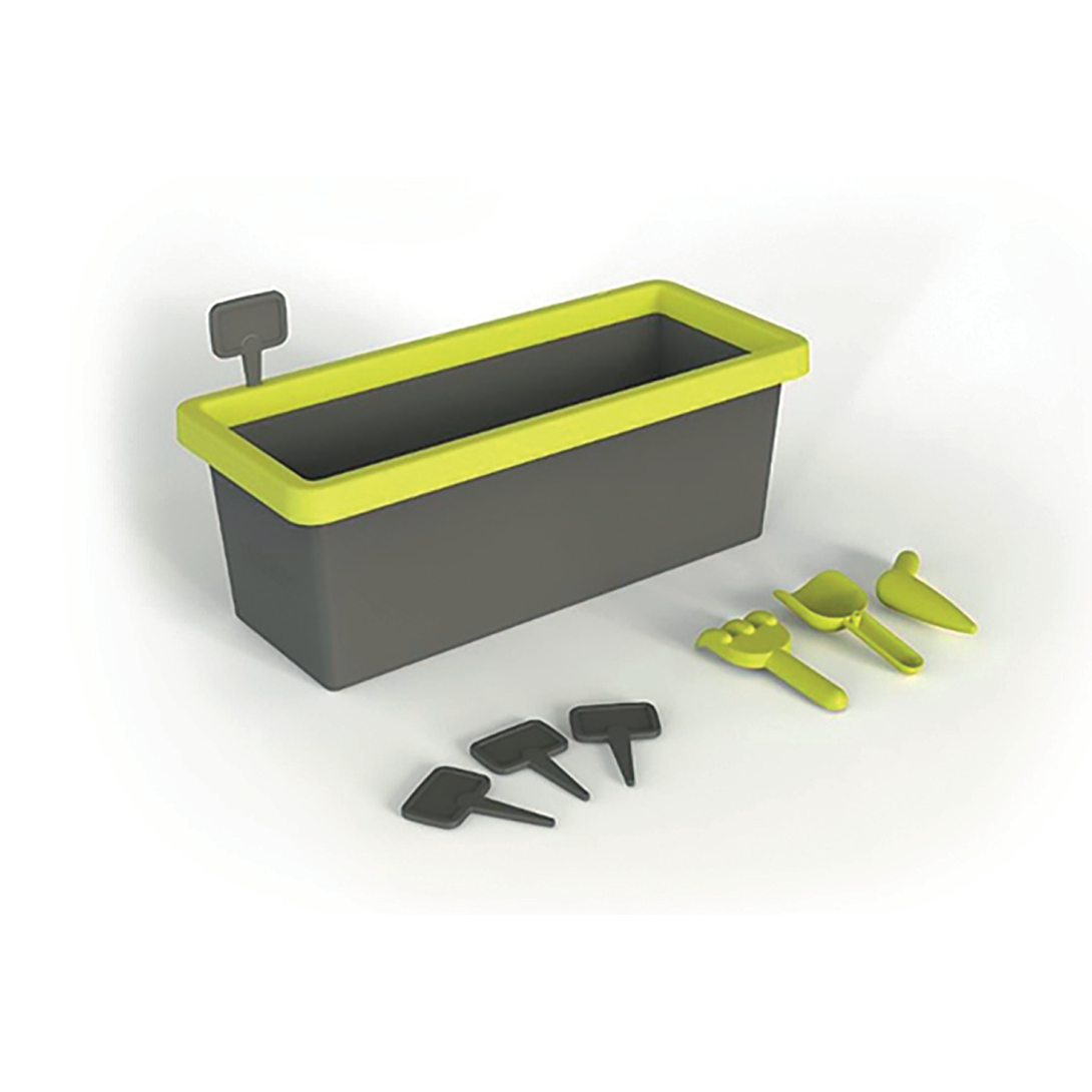 Jardinière garnie avec 4 écriteaux, une pelle, un râteau, un plantoir. Bac de 20L avec zone de rétention d'eau (fond à percer au choix) . A partir de 2 ans - Fabrication française