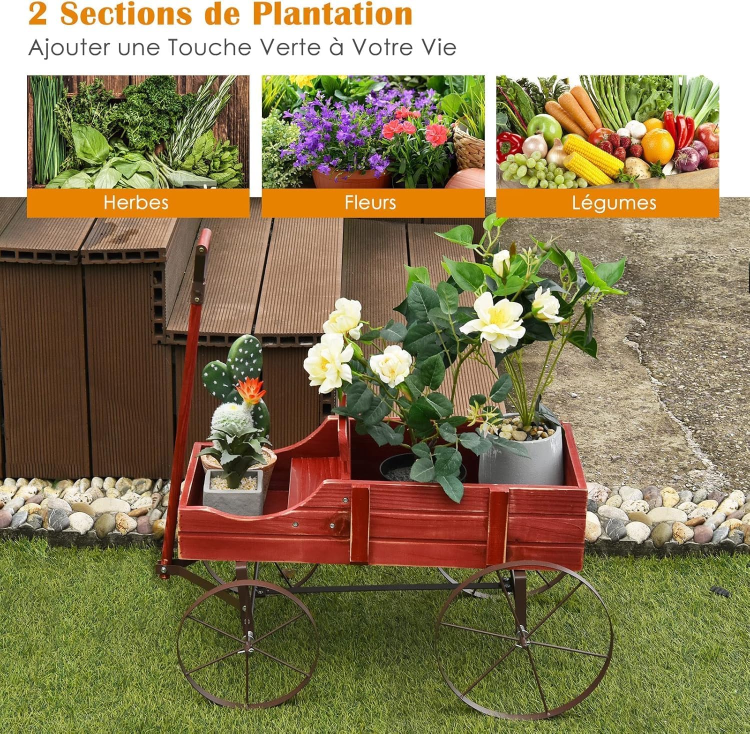 Jardinière forme brouette, brouette décorative en bois avec 4 roues en métal, 2 bac de plantation séparés