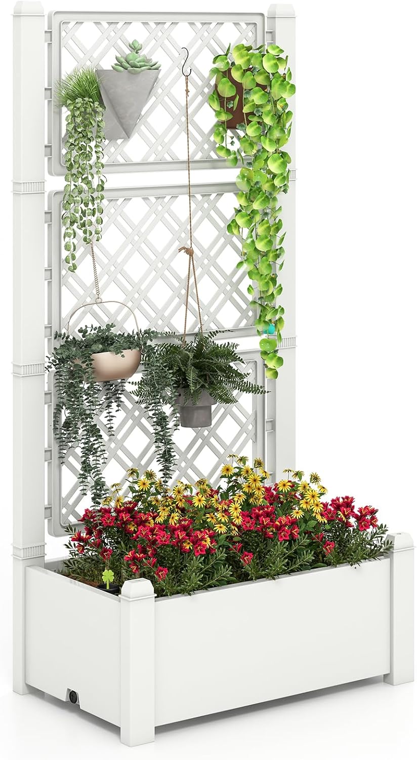 Dotée d'une grande boîte de plantation avec beaucoup d'espace, cette jardinière facilite la culture de différentes variétés de fruits, légumes, fleurs et herbes aromatiques. Le treillis offre un soutien supplémentaire pour les plantes grimpantes et les ornements suspendus. Avec une conception pratique de stockage d'eau et une construction robuste, ce potager surélevé garantit des conditions de croissance optimales et une durabilité longue durée. De plus, polyvalent et élégant, ce potager se fond parfaitement dans divers environnements extérieurs. Profitez d'une expérience de jardinage flexible et personnalisée avec ce potager polyvalent.