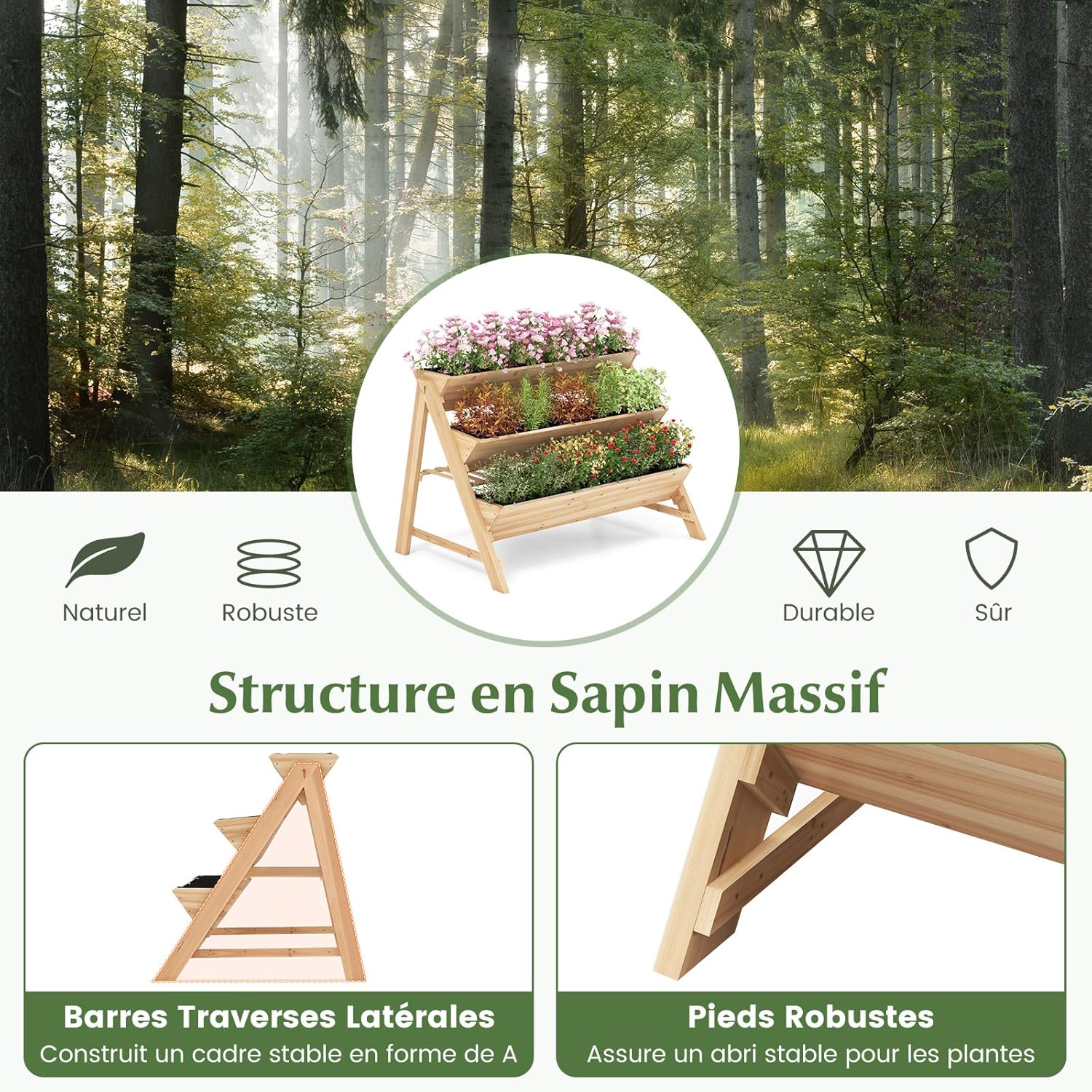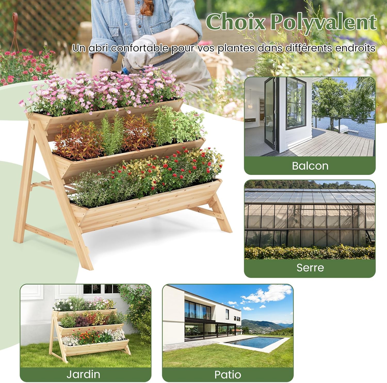 | Libellé | Jardinière surélevée vertical 3 niveaux en bois, étagère de rangement, 2 crochets, 3 doublures de bac |