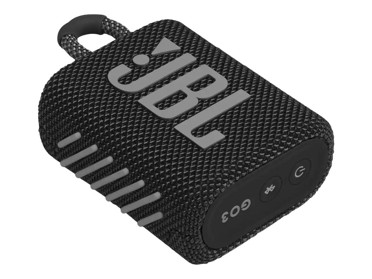JBL GO 3. Diamètre du woofer (impérial): 3,81 cm (1.5"), Diamètre du woofer: 4,7 cm. Puissance évaluée de RMS: 4,2 W, Gamme de fréquence: 110 - 20000 Hz, Rapport signal-sur-bruit: 85 dB. Technologie de connectivité: Sans fil, Profils Bluetooth: A2DP, AVRCP, Modulation d’émetteur Bluetooth: 8DPSK, DQPSK, GFSK. Couleur du produit: Noir, Conception du produit: Rectangle, Matériau du boîtier/corps: Plastique. Utilisation recommandée: Universel