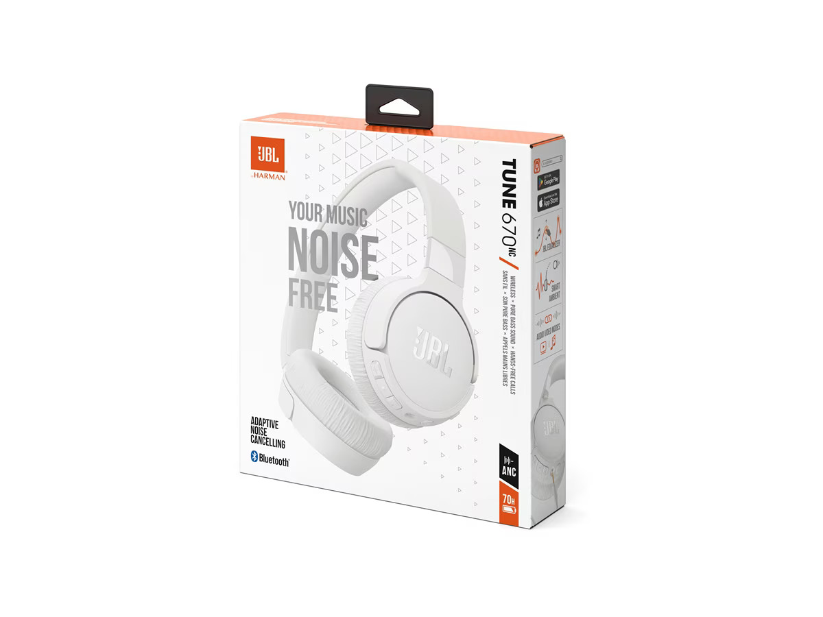 JBL Tune 670 NC. Type de produit: Casque. Technologie de connectivité: Avec fil &sans fil, Bluetooth. Utilisation recommandée: Appels/Musique. Fréquence des écouteurs: 20 - 20000 Hz. Poids: 188 g. Couleur du produit: Blanc
