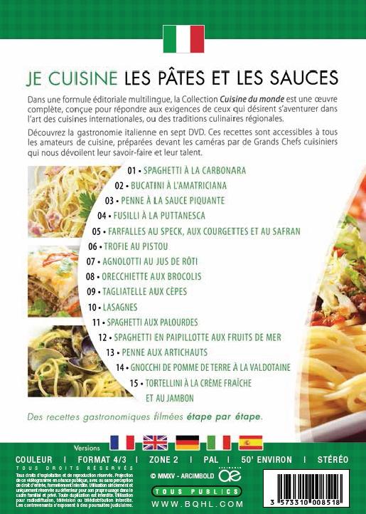 Les recettes les plus originales de la cuisine italienne recueillies dans un DVD monographique 1. SPAGHETTIS À LA CARBONARA 2. BUCATINIS À L'AMATRICIANA 3. PENNES À LA SAUCE PIQUANTE 4. FUSILLIS À LA PUTTANESCA 5. FARFALLES AU SPECK, AUX COURGETTES ET AU SAFRAN 6. TROFIE AU PISTOU 7. AGNOLOTTI AU JUS DE RÔTI 8. ORECCHIETTE AUX BROCOLIS 9. TAGLIATELLE AUX CEPES 10. LASAGNES 11. SPAGHETTIS AUX PALOURDES 12. SPAGHETTIS EN PAIPILLOTTE AUX FRUITS DE MER 13. PENNES AUX ARTICHAUTS 14. GNOCCHIS DE POMME DE TERRE A LA VALDOTAINE 15. TORTELLINIS À LA CREME FRAICHE ET AU JAMBON.