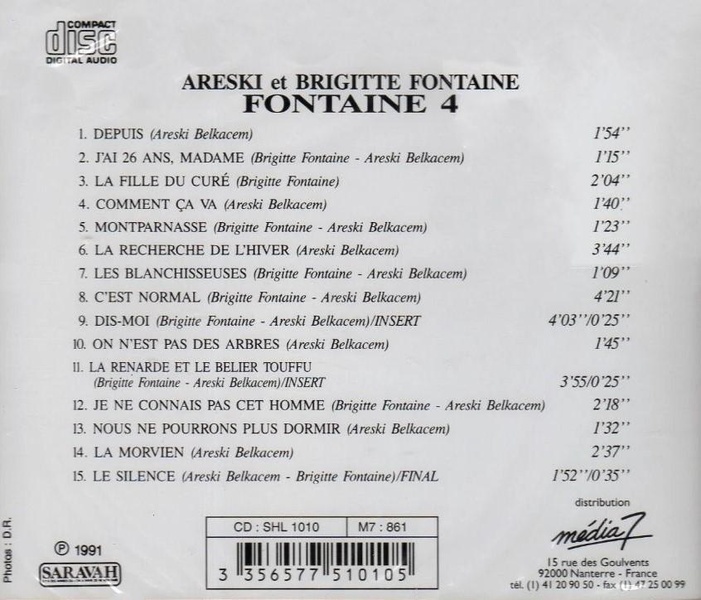 | Liste des pistes | 1.01 . depuis - Belkacem, Areski, Fontaine, Brigitte1.02 . j'ai 26 ans, madame - Belkacem, Areski, Fontaine, Brigitte1.03 . la fille du curé - Fontaine, Brigitte1.04 . comment ca va - Belkacem, Areski, Fontaine, Brigitte1.05 . montparnasse - Belkacem, Areski, Fontaine, Brigitte1.06 . la recherche de l'hiver - Belkacem, Areski, Fontaine, Brigitte1.07 . les blanchisseuses - Belkacem, Areski, Fontaine, Brigitte1.08 . c'est normal - Belkacem, Areski, Fontaine, Brigitte1.09 . dis-moi - Belkacem, Areski, Fontaine, Brigitte1.10 . on n'est pas des arbres - Belkacem, Areski, Fontaine, Brigitte1.11 . la renarde et le bélier touffu - Belkacem, Areski, Fontaine, Brigitte1.12 . je ne connais pas cet homme - Belkacem, Areski, Fontaine, Brigitte1.13 . nous ne pourrons plus dormir - Belkacem, Areski, Fontaine, Brigitte1.14 . la morvien - Belkacem, Areski, Fontaine, Brigitte1.15 . le silence - Belkacem, Areski, Fontaine, Brigitte |