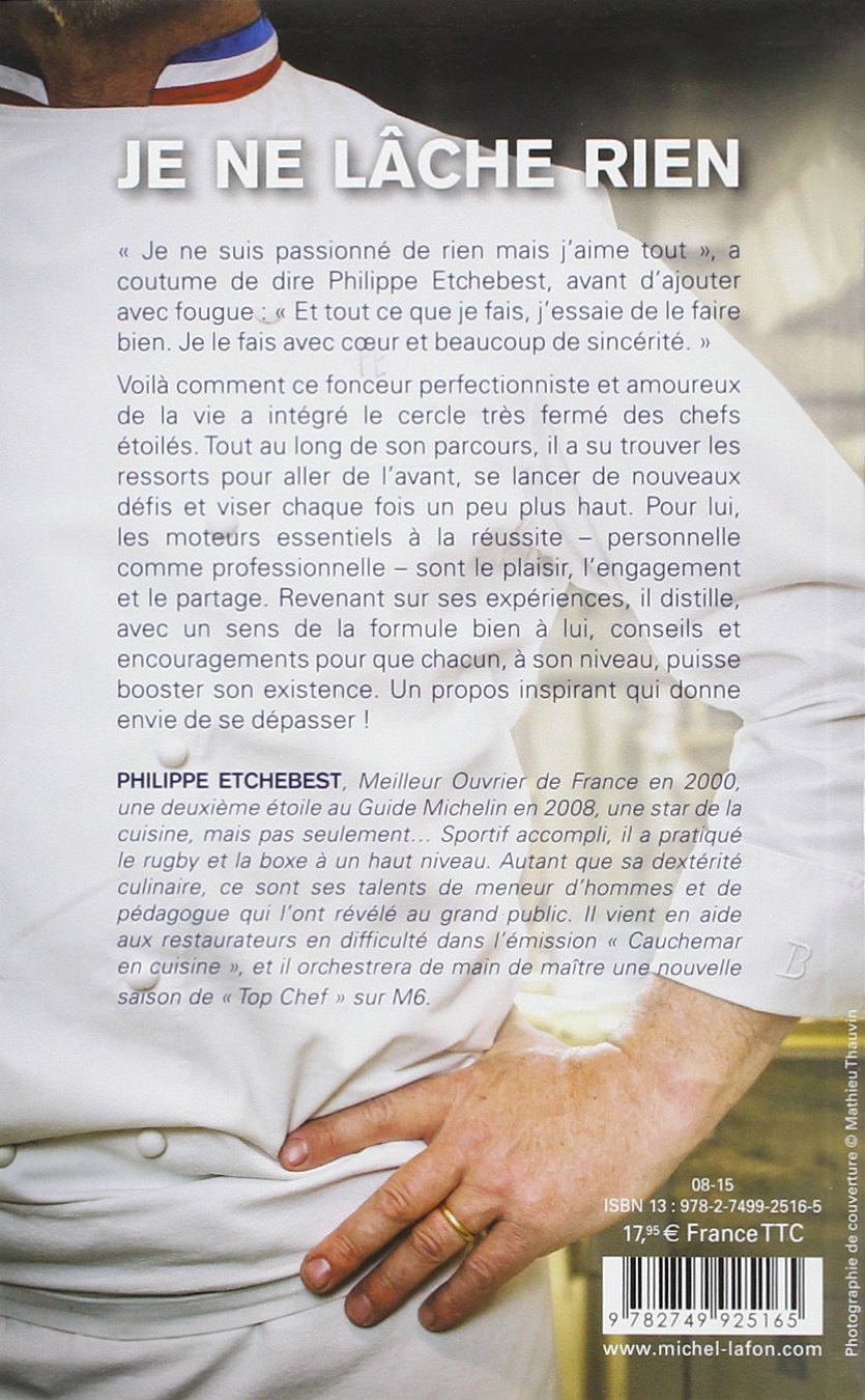 «Je ne suis passionné de rien mais j'aime tout», a coutume de dire Philippe Etchebest, avant d'ajouter avec fougue : «Et tout ce que je fais, j'essaie de le faire bien. Je le fais avec coeur et beaucoup de sincérité.» Voilà comment ce fonceur perfectionniste et amoureux de la vie a intégré le cercle très fermé des chefs étoilés. Tout au long de son parcours, il a su trouver les ressorts pour aller de l'avant, se lancer de nouveaux défis et viser chaque fois un peu plus haut. Pour lui, les moteurs essentiels à la réussite - personnelle comme professionnelle - sont le plaisir, l'engagement et le partage. Revenant sur ses expériences, il distille, avec un sens de la formule bien à lui, conseils et encouragements pour que chacun, à son niveau, puisse booster son existence. Un propos inspirant qui donne envie de se dépasser !