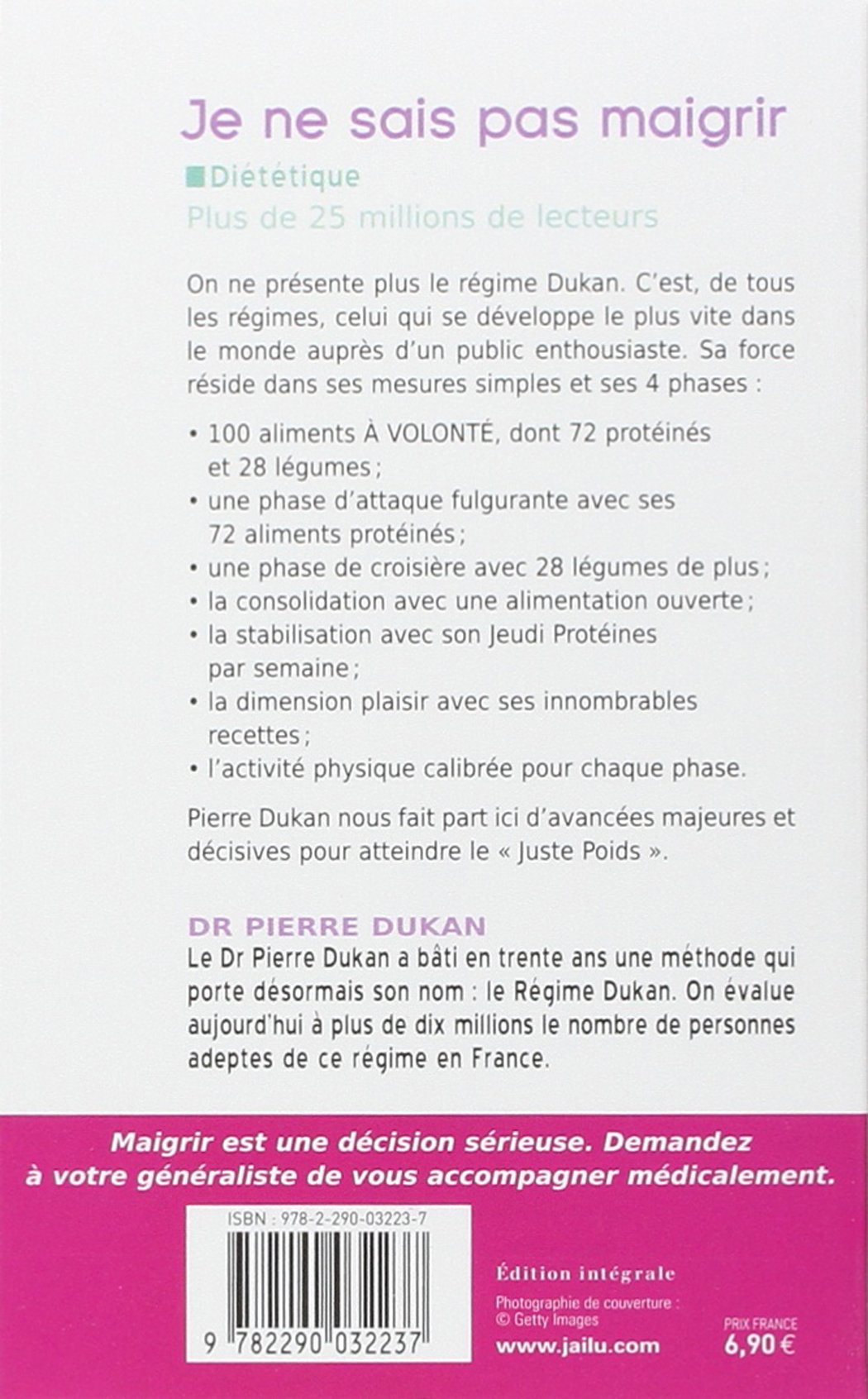 On ne présente plus le régime Dukan. C'est aujourd'hui celui qui fait le plus d'adeptes à travers le monde, auprès d'un public toujours plus enthousiaste. Sa force réside dans sa simplicité et ses 4 phases : une phase d'attaque fulgurante avec ses 72 protéines, une phase de croisière avec 28 légumes ajoutés, une phase de consolidation avec une alimentation ouverte, une phase de stabilisation avec son "Jeudi Protéines" par semaine. 100 aliments, 72 protéines et 28 légumes A volonté. La dimension plaisir avec ses innombrables recettes. L'activité physique calibrée pour chaque phase. Dans cette édition augmentée de trois nouveaux chapitres, le Dr Pierre Dukan nous fait part d'avancées majeures et décisives pour atteindre le "Juste Poids".