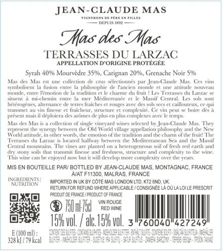 | Libellé | Jean Claude Mas, Mas Des Mas, 2024 - Terrasses du Larzac AOP - Rouge - 75 cl |