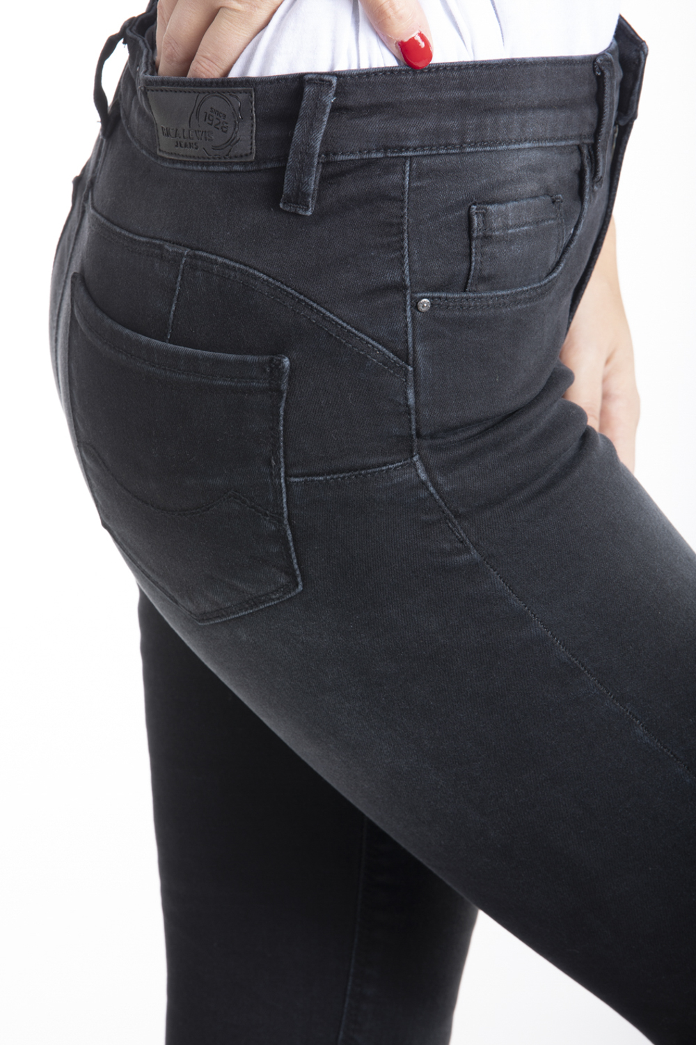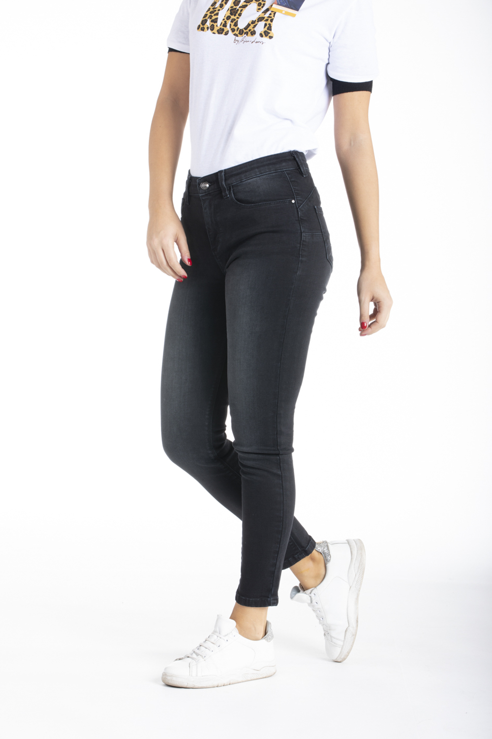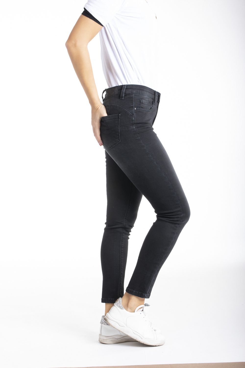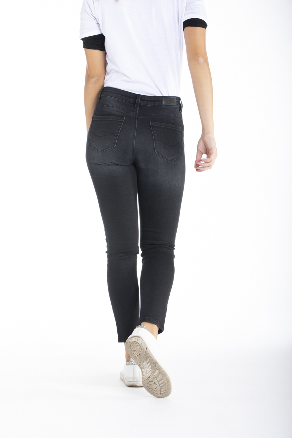 Jeans 5 poches, coupe slim galbante, coutures effet push-up, longueur chevilles, taille haute, denim gris stretch overdyed, brossé, COTON 98% ELASTHANNE 2%. La longueur d'entrejambe : 72 cm pour la taille 38. Le mannequin porte une taille 38.
