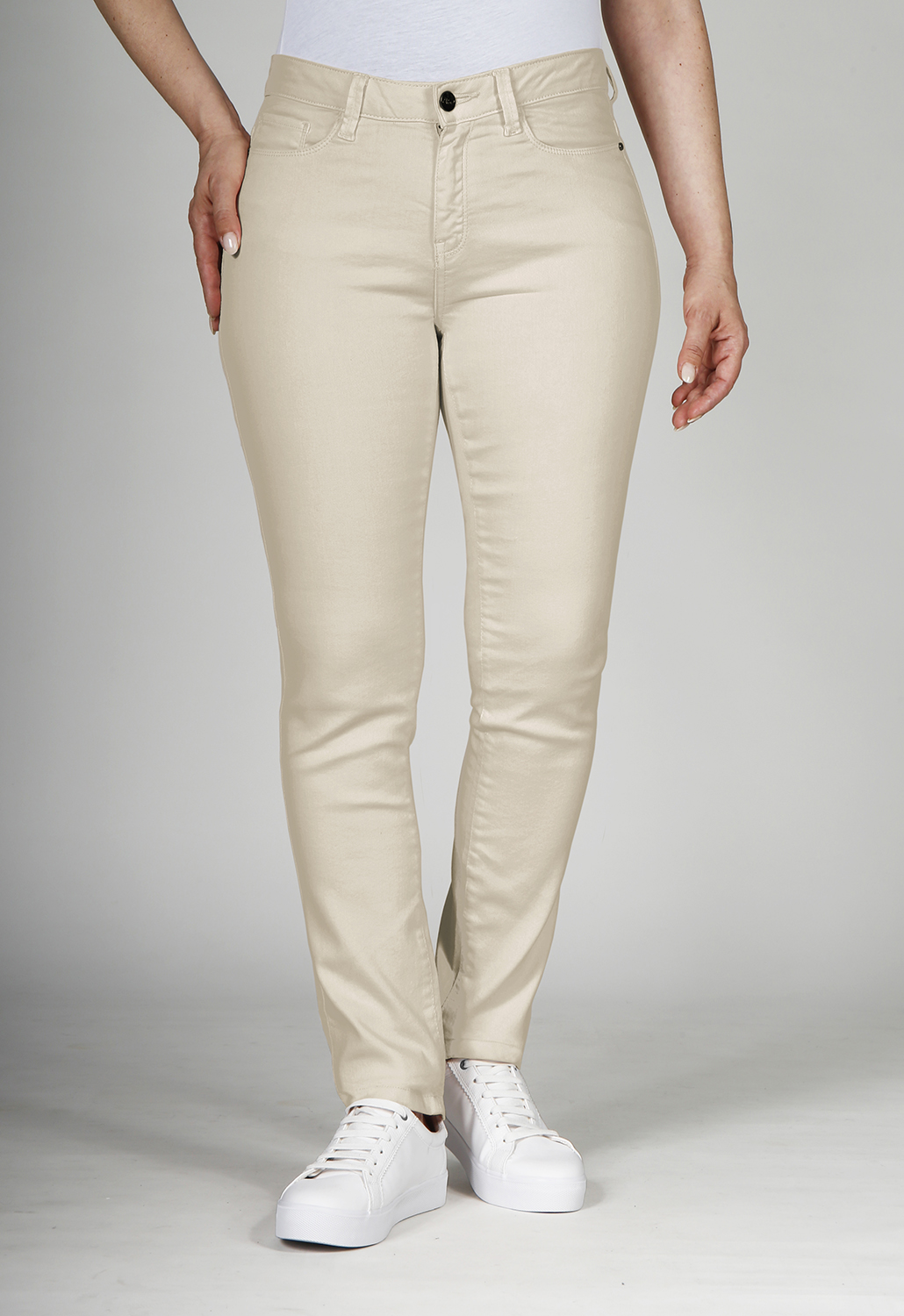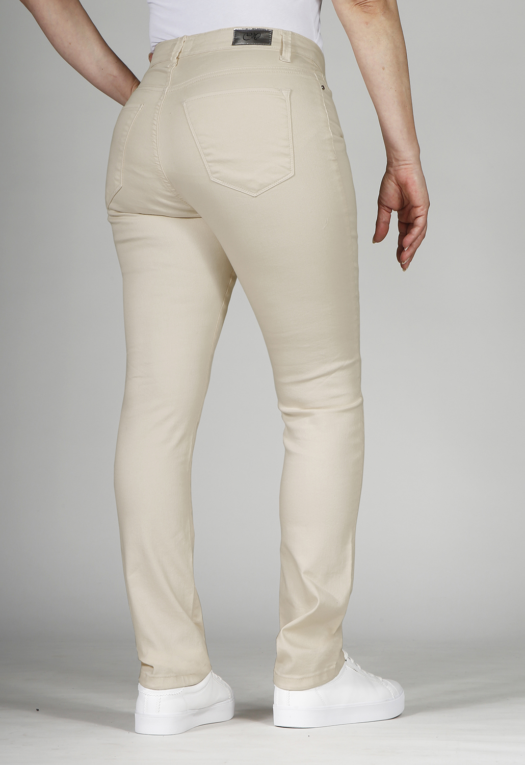 Jeans slim coupe confort Jeans, 5 poches, coupe ajustée, taille haute, fermeture zippée, denim ultra stretch couleur, surpiqûres deux tons, 81% coton 17% polyester 2% élasthanne. Longueur d'entrejambe : tailles 40 et 42 : 78 cm; tailles 44, 46 et 48 : 80 cm; tailles 50 et 52 : 82 cm Le mannequin porte une taille 40.