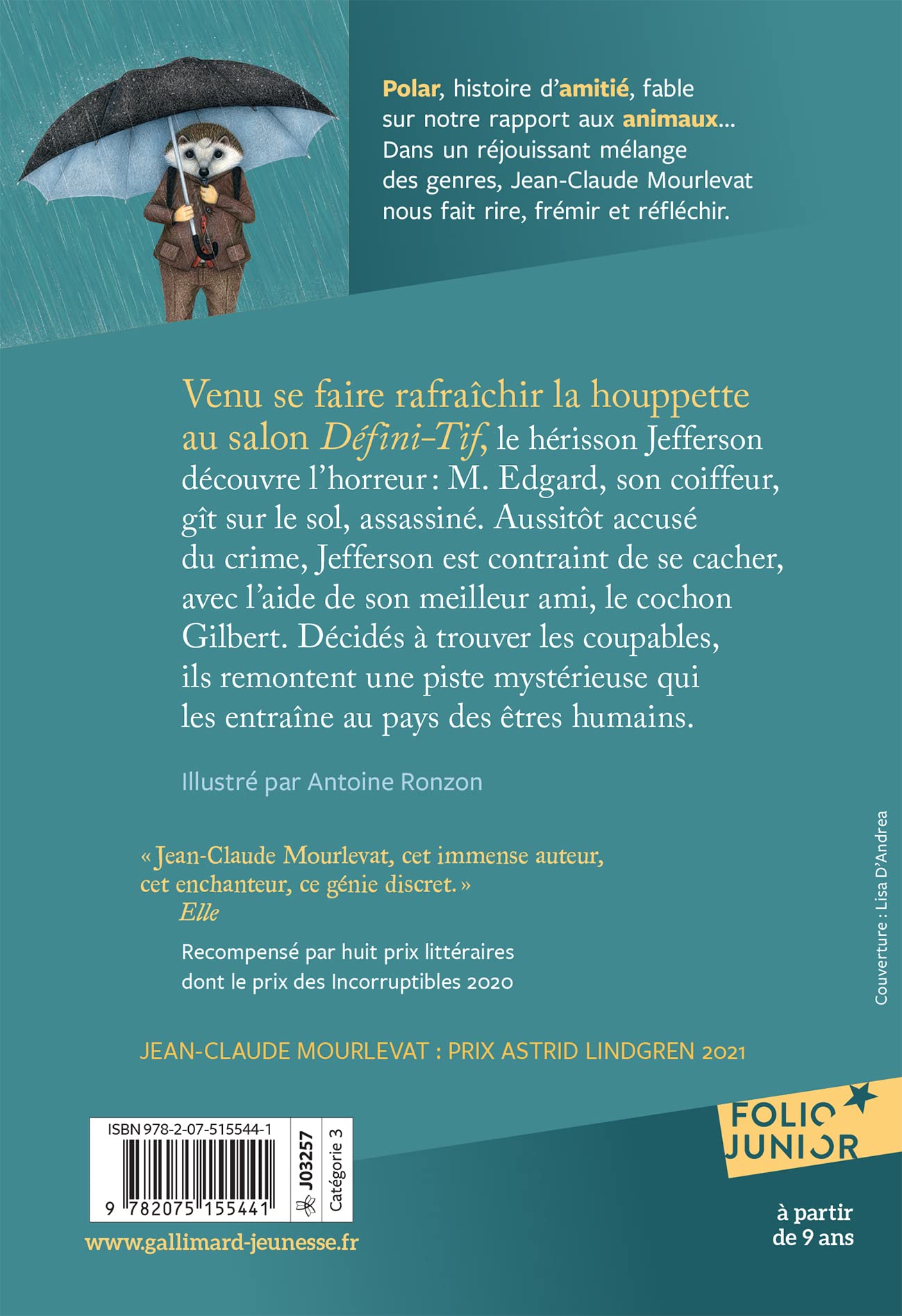 Venu se faire rafraîchir la houppette au salon Défini-Tif, le hérisson Jefferson découvre l'horreur : M. Edgard, son coiffeur, gît sur le sol, assassiné. Aussitôt accusé du crime, Jefferson est contraint de se cacher, avec l'aide de son meilleur ami, le cochon Gilbert. Décidés à trouver les coupables, ils remontent une piste mystérieuse qui les entraînent au pays des êtres humains. PRIX ASTRID LINDGREN 2021 Titre recommandé par l'Éducation nationale en classe de CM1-CM2
