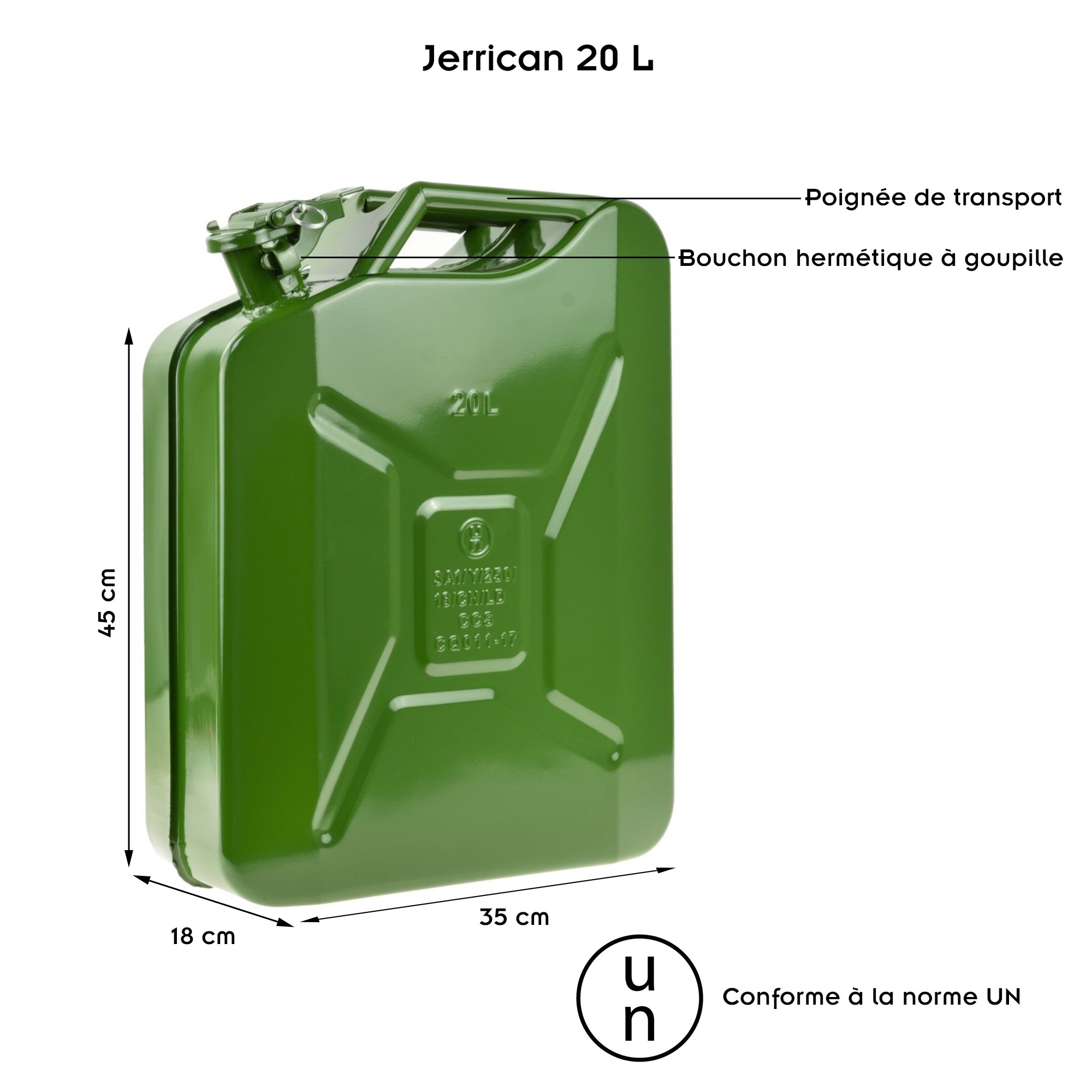 | Libellé | Jerrican essence en métal avec bouchon hermétique Vert 20 L |