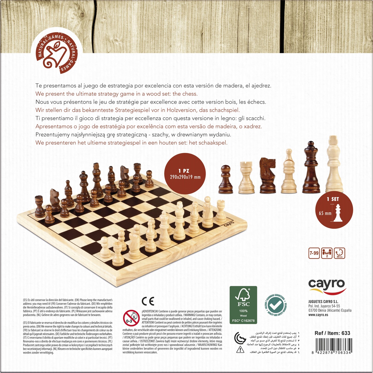 Jeu d'échecs de la marque Cayro, fabriqué en bois avec les cases peintes et ensuite vernies mat. Cet échiquier contient un jeu de pièces d'échecs en bois. Le plateau en bois mesure 30 x 30 x 5 cm.