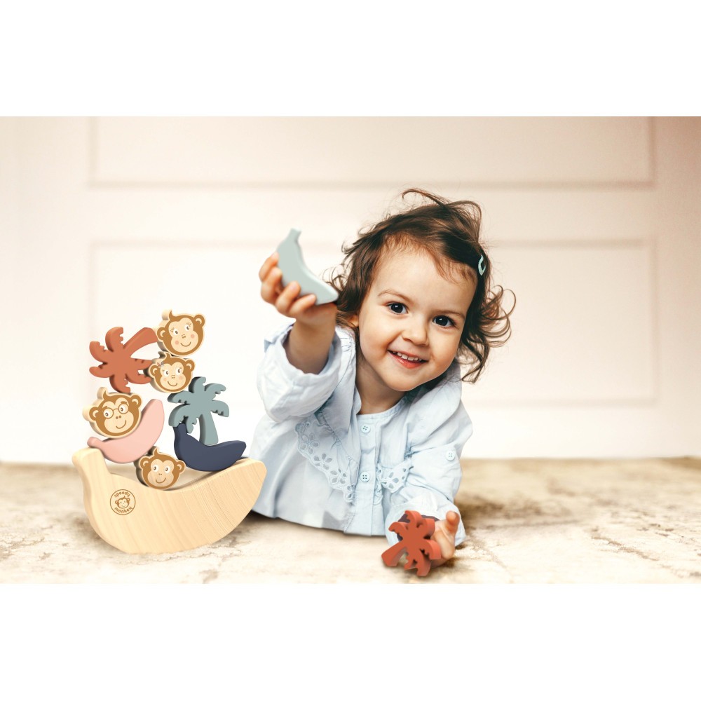 Ces amusants blocs à empiler en bois incluent des blocs colorés tels que des bananes, des palmiers et des singes, avec une plus grande banane servant de base pour la balance.