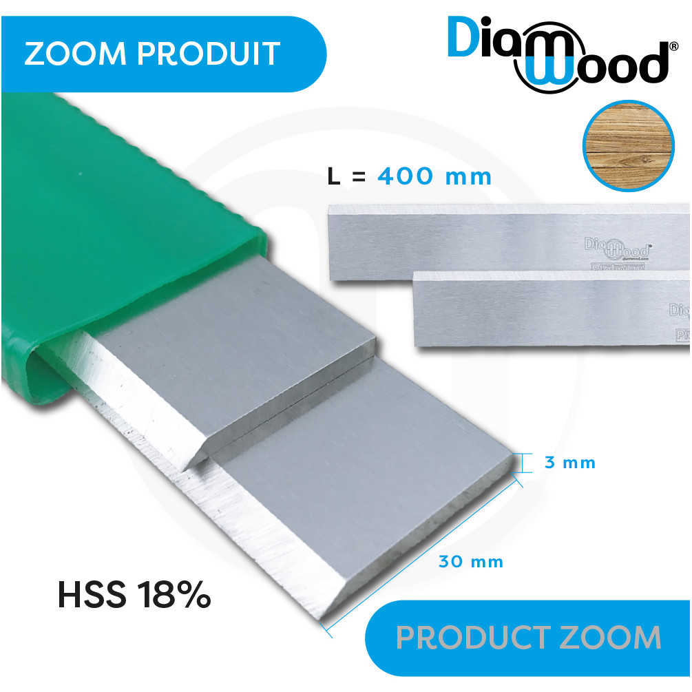 | Libellé | Jeu de 2 Fers de Dégauchisseuse/Raboteuse Green Line 400 x 30 x 3 mm Acier HSS 18% (les 2 Fers) - Diamwood |
