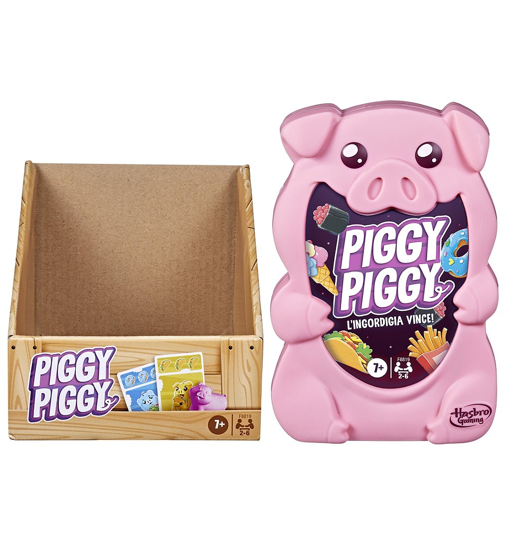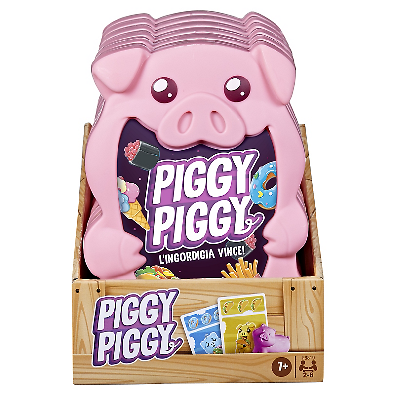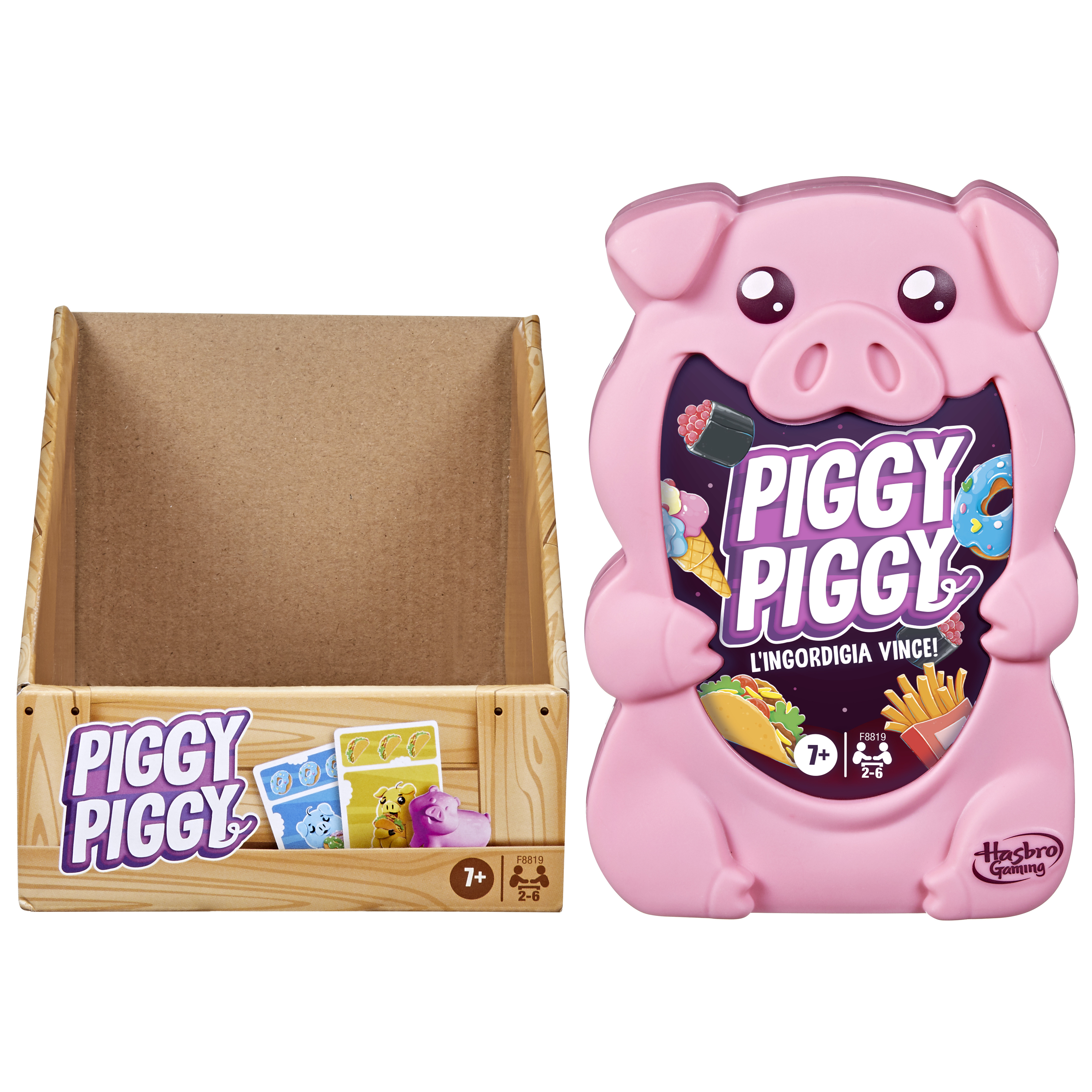 On vole des cochons pour gagner ! Le jeu Piggy Piggy est un jeu de cartes familial rapide aussi simple qu'amusant ! À tour de rôle, les joueurs jouent des cartes Nourriture de leur main pour tenter de voler des cochons et marquer le plus de points possible. Chaque joueur commence la partie avec 5 cartes, incluant des cartes Nourriture colorées comme des tacos (jaunes) et des cornets de glace (roses). À son tour, un joueur place toutes les cartes d'un même type de nourriture de sa main en une pile. Si sa pile contient la plus grande quantité de nourriture, il obtient le cochon de la couleur correspondante, ou il peut le voler à un autre joueur ! Un joueur a une carte Chèvre ? Il peut l'utiliser pour saboter la stratégie d'un adversaire en se défaussant d'une carte Nourriture de sa pile et peut-être même en le forçant à donner son cochon ! Lorsqu'un joueur pioche des cartes à la fin de son tour, si ce joueur a des cochons, il marque un point pour chaque carte piochée de la même couleur qu'un de ses cochons. Le premier joueur à marquer 8 points gagne la partie ! Le jeu Piggy Piggy est un choix fantastique pour tous ceux qui recherchent des jeux de cartes amusants pour les enfants et les adultes. Piggy Piggy et tous les termes associés sont des marques de commerce de Hasbro.