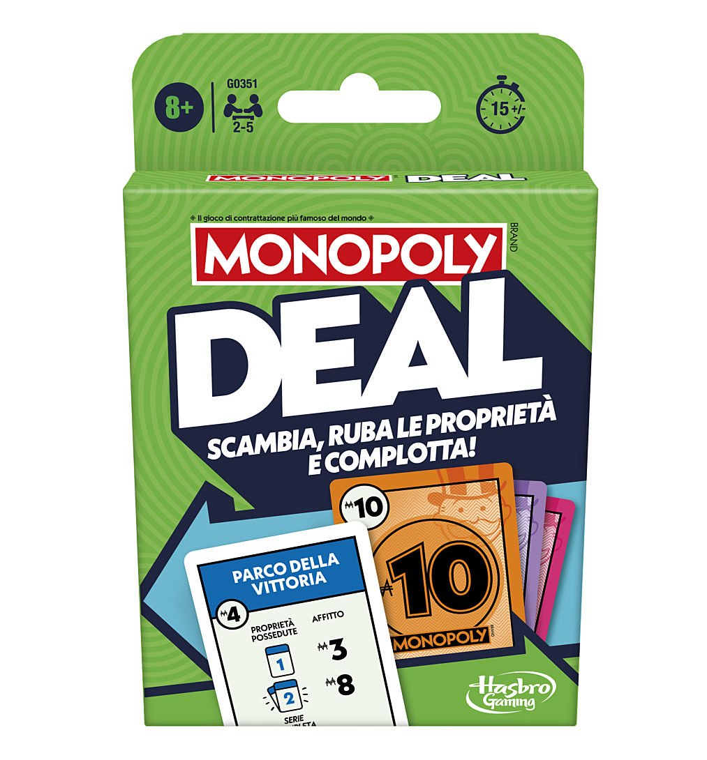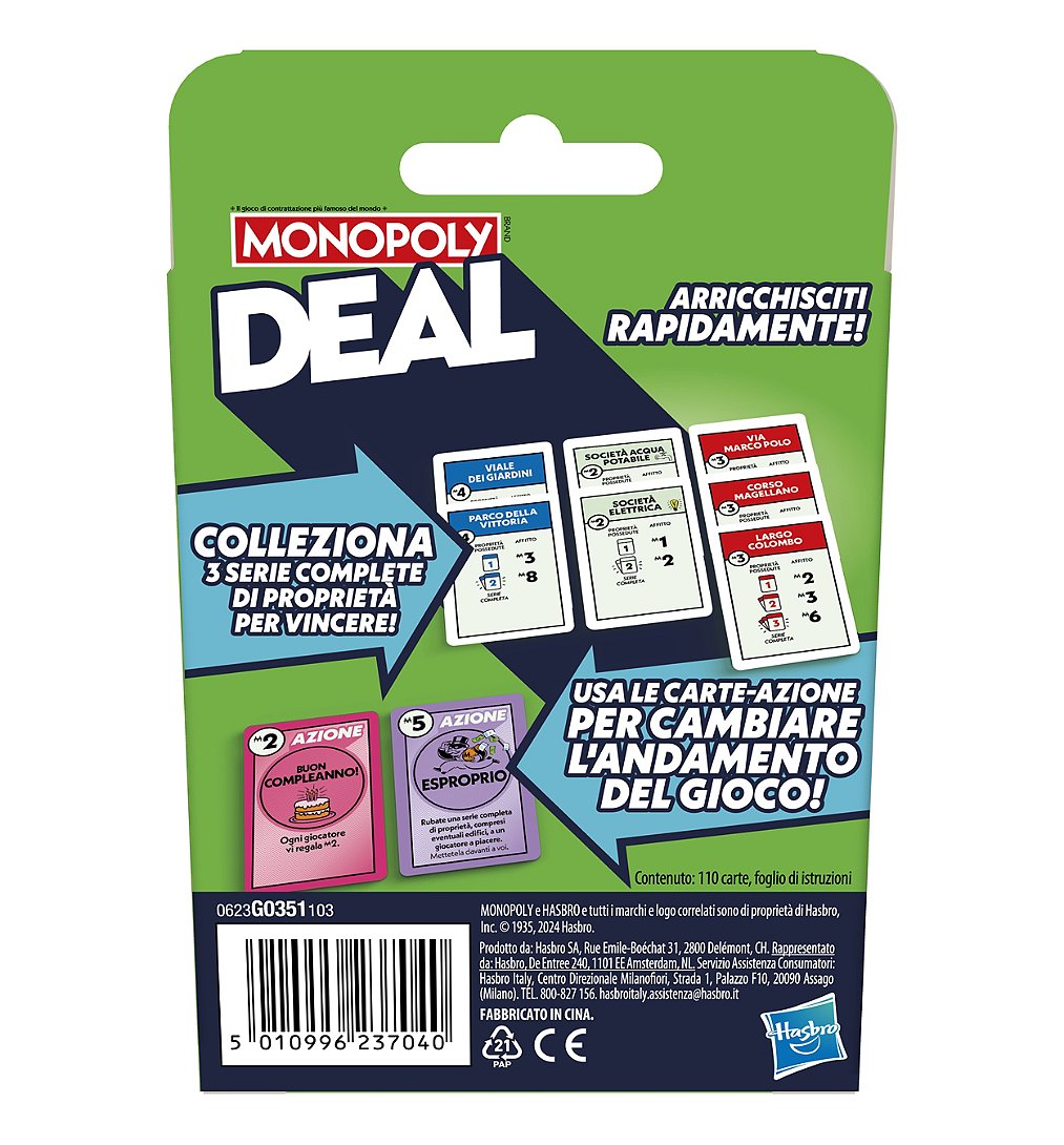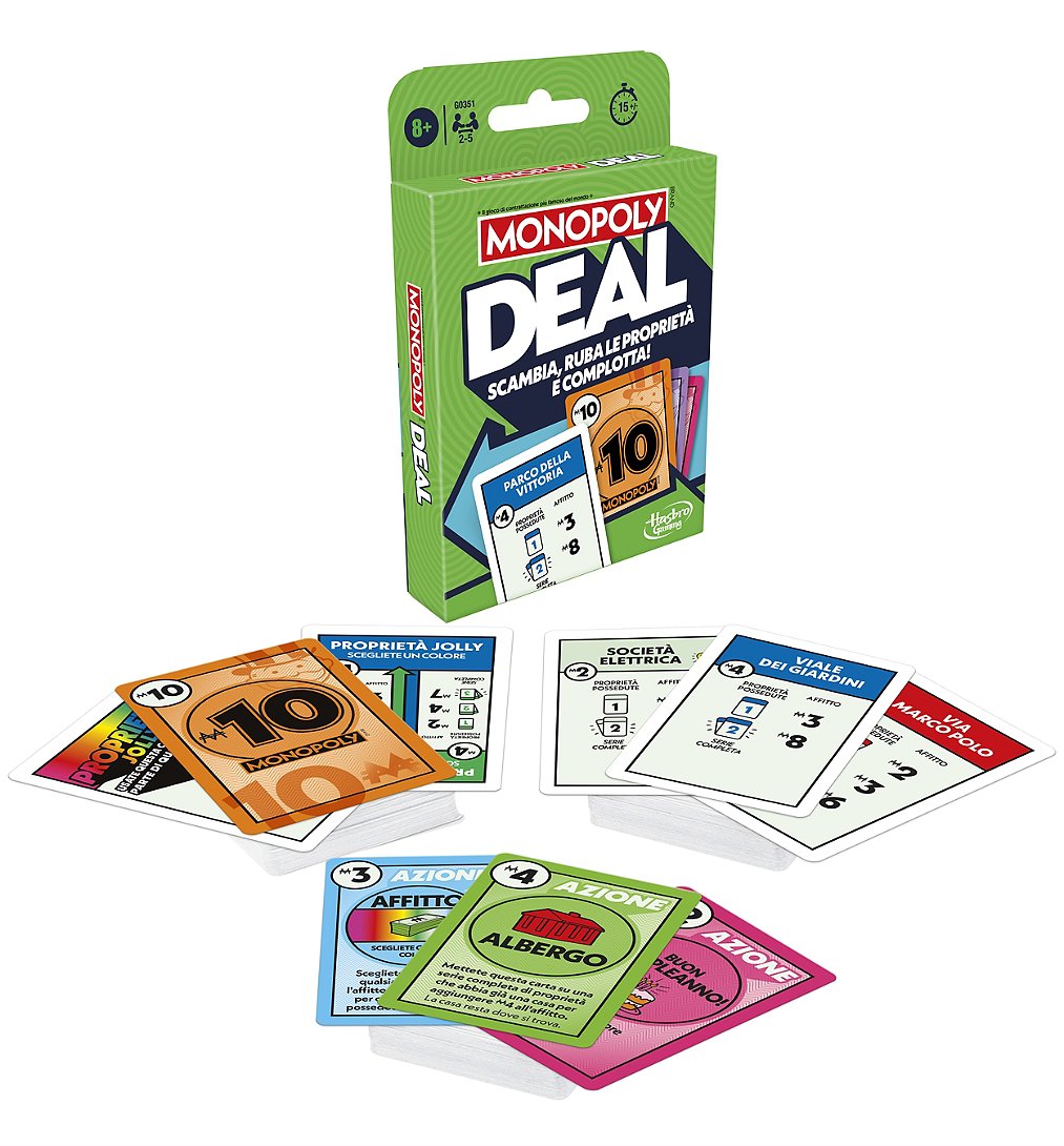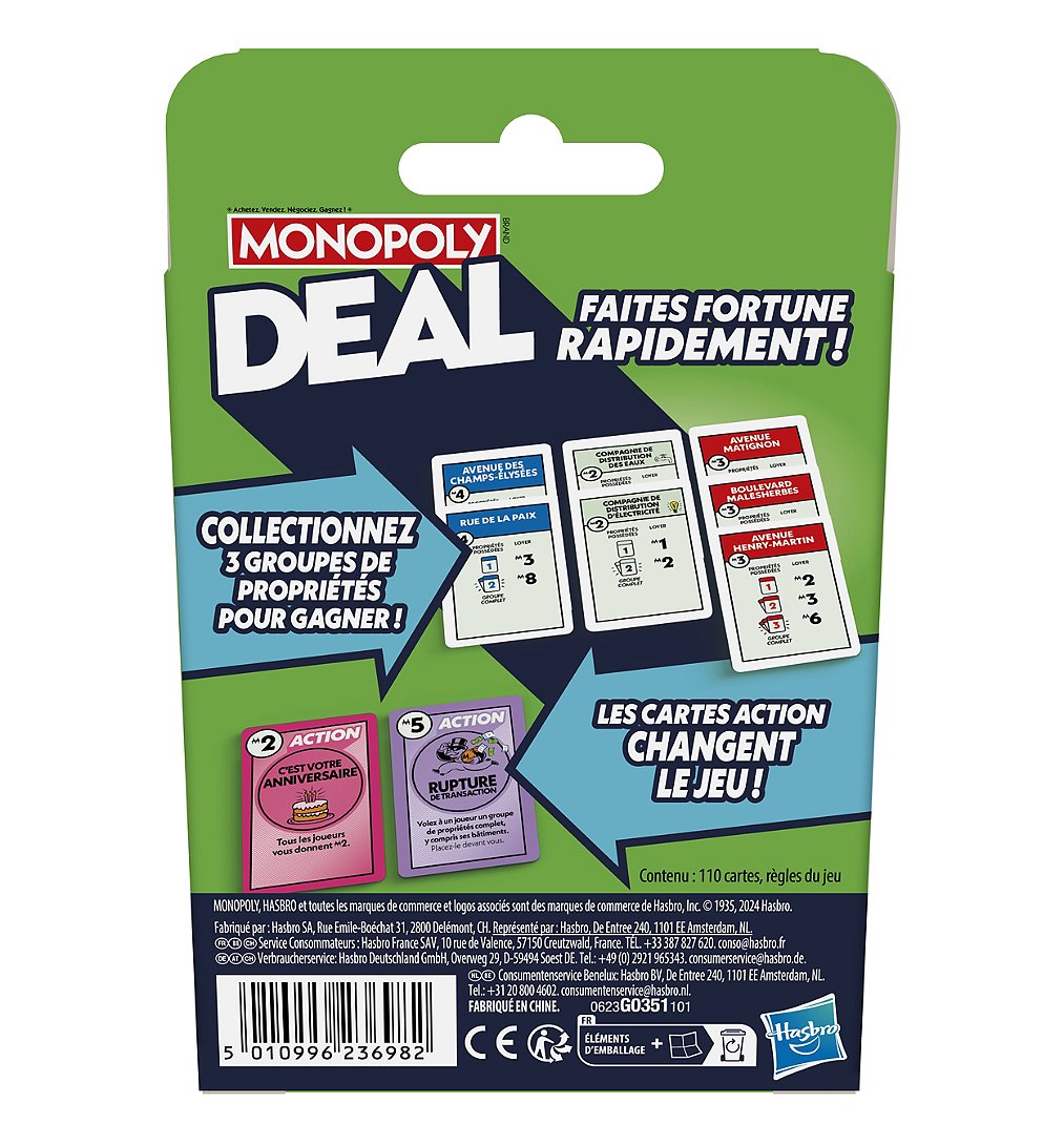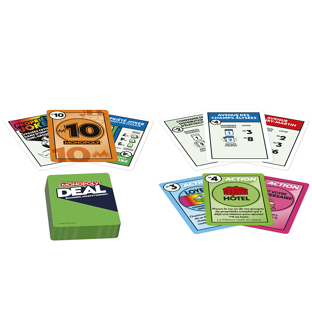 On échange et on vole pour gagner au jeu de cartes Monopoly Deal ! Le premier joueur à collectionner 3 groupes de propriétés de couleurs différentes gagne. Ce paquet inclut 110 cartes : Cartes Propriété, cartes Propriété joker, Cartes Action et cartes Argent. Les cartes Propriété Joker aident les joueurs à collectionner des groupes de propriétés. Les cartes Action modifient la partie en permettant entre autres aux joueurs de percevoir un loyer, de voler et d'échanger des propriétés. Dans ce jeu, les joueurs paient leurs dettes avec les cartes Argent. Facile à jouer et à mettre en place, ce jeu de cartes se joue en aussi peu que 15 minutes ! À partir de 8 ans. Que l'on recherche des jeux amusants pour enfants et adultes, des jeux pour la famille ou des jeux de voyage pour enfants, c'est un super choix pour toutes les occasions. Le logo Hasbro Gaming, le logo Parker Brothers le logo Monopoly et tous les autres titres, logos, personnages, les quatre coins du plateau, le nom et le personnage Mr. Monopoly, ainsi que chacun des éléments distinctifs du plateau et les pions de jeu, sont des marques commerciales d’Hasbro, Inc. pour son jeu des transactions immobilières et son équipement de jeu. © 1935, 2021 Hasbro.