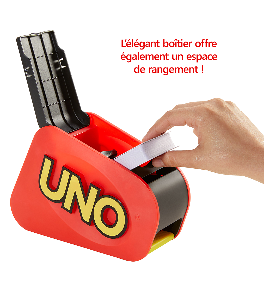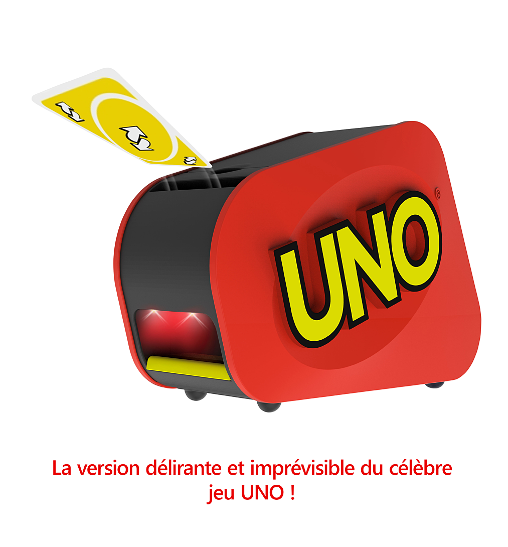 | Plus produit | Le jeu que tout le monde adore devient encore plus amusant et convivial dans lédition UNO® Extreme !\nCette version du distributeur UNO® Extreme stimule laction, le suspense et la surprise. Il bénéficie dun look design, de lumières et deffets sonores, et les cartes senvolent encore plus haut ! Les lumières et les sons se font de plus en plus pressants pour augmenter le suspense !\nGlissez les cartes dans le distributeur, puis suivez les règles classiques de UNO®, mais attention aux cartes qui jaillissent du distributeur lorsque la carte Coup Extrême fait son apparition : une, cinq ? Surprise.\nQuand il ne vous reste plus quune seule carte, noubliez pas de crier « UNO ».\nParfait pour les soirées ludiques, ce jeu est le cadeau idéal pour les amateurs de jeux de cartes de 7 ans et plus. |