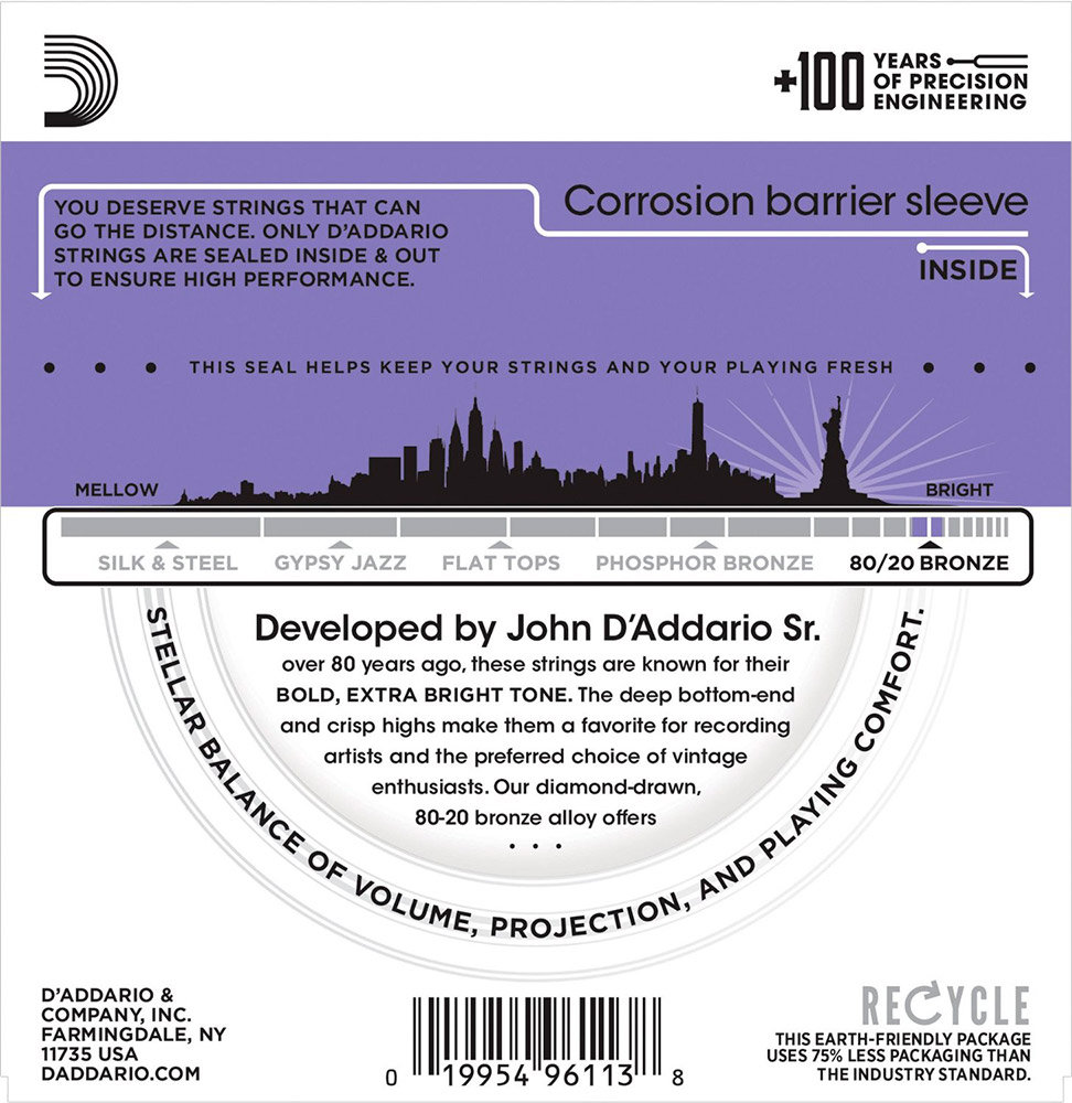 D'addario fabrique beaucoup de cordes différentes. Les EJ10-11-12-13 font partie de leur jeux "légendaires". L'alliage utilisé est le bronze.