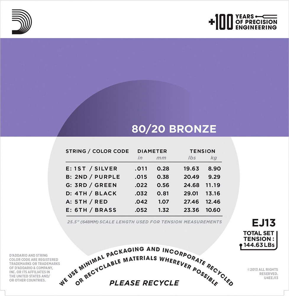 Jeu de cordes guitare acoustique D'Addario EJ13 light 80/20 Bronze 11-52