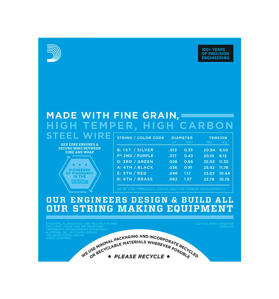 Voici le détail de chaque corde : B 013 (Si) - F# 017 (Fa#) - D 026 (Ré) - A 036 (La) - Mi 046 (Mi) - B 062 (Si).