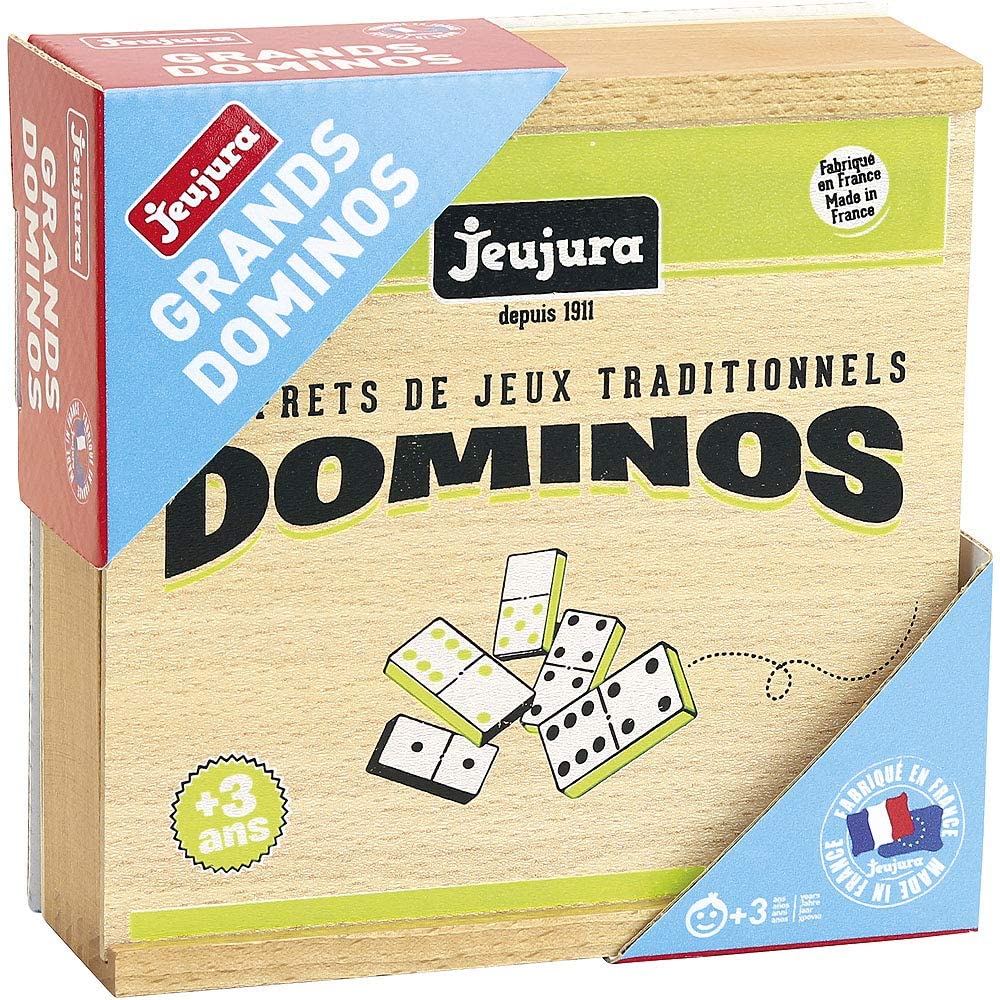 Ce coffret en bois contient 28 grands dominos en bois, fabriqués en France par Jeujura.