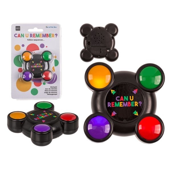 Ce jeu électronique est un jeu de mémoire parfait pour stimuler la capacité de mémorisation d'un enfant. Il émet des couleurs et des sons dont les séquences sont à mémoriser et à reproduire. Tout en s'amusant, développera sa mémoire.* Batterie : 2 piles LR44 (fournies) * Dimensions : 6,3 x 6,3 x 2 cm * Jeu électronique sonore Fonctions : jeu de mémoire électronique Contenu : 1 jeu de mémoire électronique Can U remember