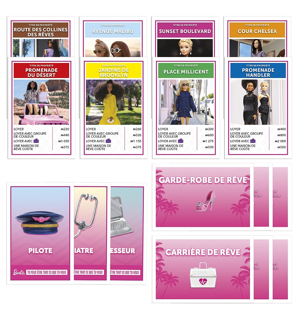 | La boîte contient | Inclut plateau de jeu, 6 pions, 16 titres de propriété, 6 cartes Tu peux être tout ce que tu veux, 16 cartes Garde-robe de rêve, 16 cartes Carrière de rêve, 16 maisons de rêve, 2 dés (1 dé standard, 1 dé Barbie), liasse de billets Monopoly et règles du jeu. |