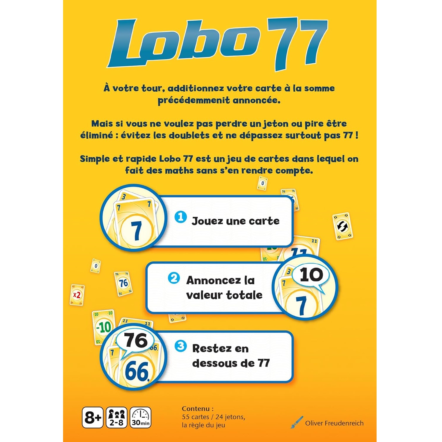 | Règles du jeu | Chaucn reçoit 3 jetons puis 5 cartes d'une certaine valeur. A chaque tour, vous ajoutez une carte sur la pile, annoncez le nouveau total des cartes empilées puis vous piochez. Mais si le total annoncé est un doublé (11, 22, 33,.) vous perdez un jeton! Et s'il dépasse 77, alors la manche est terminée. Des cartes spéciales sont également de la partie et peuvent soit vous aider, soit vous couler ! le dernier à posséder encore des jetons à la fin de la partie remporte la victoire. Lobo 77 est un jeu très facile et plein de piments! boite tiroir en carton |