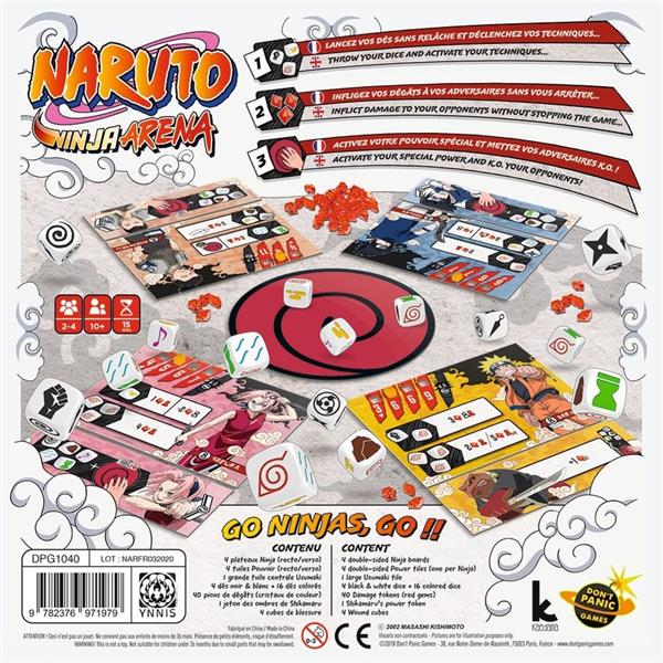 Naruto Ninja Arena vous permet d'incarner l'un des personnages emblématiques de la série tels que Naruto, Sakura ou Sasuke pour affronter les autres joueurs. Incarnez l'un des ninjas de l'univers de Naruto et représentez fièrement votre village dans un tournoi où le dernier debout l'emporte ! Lancez les dés et tentez d'obtenir des combinaisons correspondant aux pouvoirs de vos personnages. Tout se joue en simultané et sans interruption ! Les coups pleuvent, les dégâts s'enchaînent sans discontinuer. À moins que l'un des joueurs n'active son pouvoir ultime en obtenant la bonne combinaison et en plaçant sa main au centre de la table. Alors, les blessures sont résolues, et peuvent mettre hors jeu un ou plusieurs combattants. Seul le dernier ninja debout l'emportera ! Qui sera l'ultime survivant du tournoi ? Voici venu le moment des épreuves du Chûnin ! Naruto, Sasuke, Sakura et Shikamaru vont avoir une occasion unique de s'affronter et de s'entraîner pour maîtriser leurs techniques et pouvoirs spéciaux..