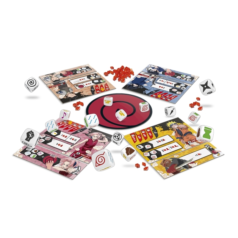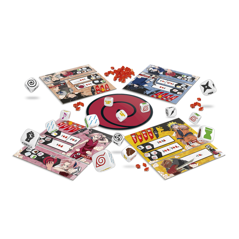 | La boîte contient | 4 plateaux Ninja double face 4 tuiles Pouvoir double face 1 grande tuile Uzumaki 4 dés noir & blanc 16 dés colorés 40 pions de dégâts 1 jeton des ombres de Shikamaru 4 cubes de blessure Livret de règles |