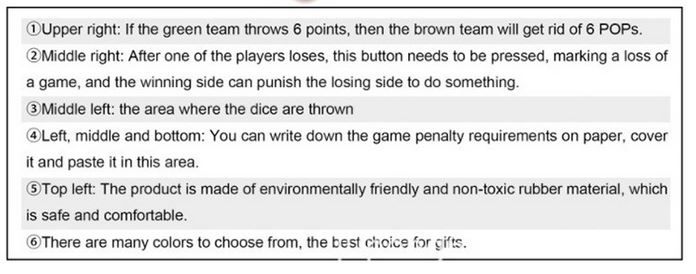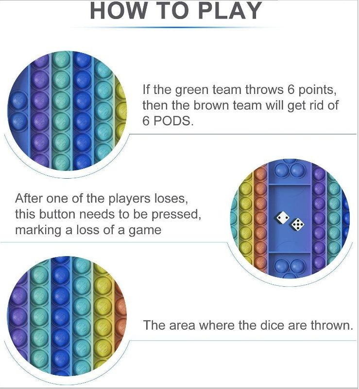 Description du jeu Les joueurs alternent en appuyant sur le nombre de données que l'adversaire lance. Le joueur qui a fait pression sur la dernière fois perd. Il exerce une pensée logique des enfants, qui est très intéressante et inspirante. Que les batailles commencent! Matériau de haute qualité Fabriqué en caoutchouc sûr pour les enfants et les adultes, la taille est de 30 cm x 17,8 cm, ce qui est suffisant pour vous amuser. Jouez à tout moment, n'importe où Ce jouet de planche sensorielle est léger et facile à transporter. Grâce à votre matériau en caoutchouc de haute qualité, il peut être plié sur votre sac afin de ne pas mentionner qu'il est lavable et réutilisable. Meilleur choix de cadeau Les jouets aident à soulager le stress et l'anxiété, ce qui en fait le cadeau parfait pour les enfants et les adultes lors des anniversaires, des fêtes, etc. Il peut non seulement soulager le stress, mais aussi former les enfants dans les connaissances mathématiques de base. Haute qualité Le matériau en silicone est sûr, inodore et ne causera aucun dommage aux humains et aux animaux de compagnie.
