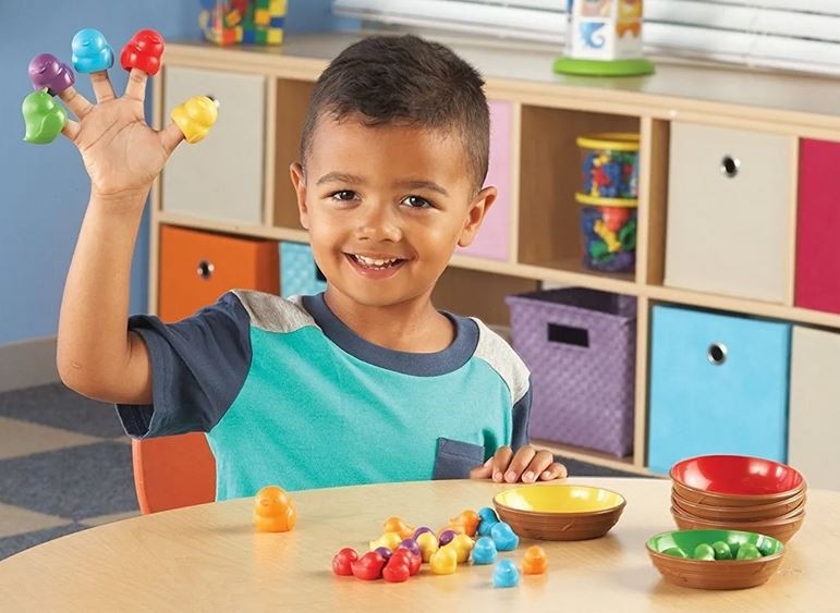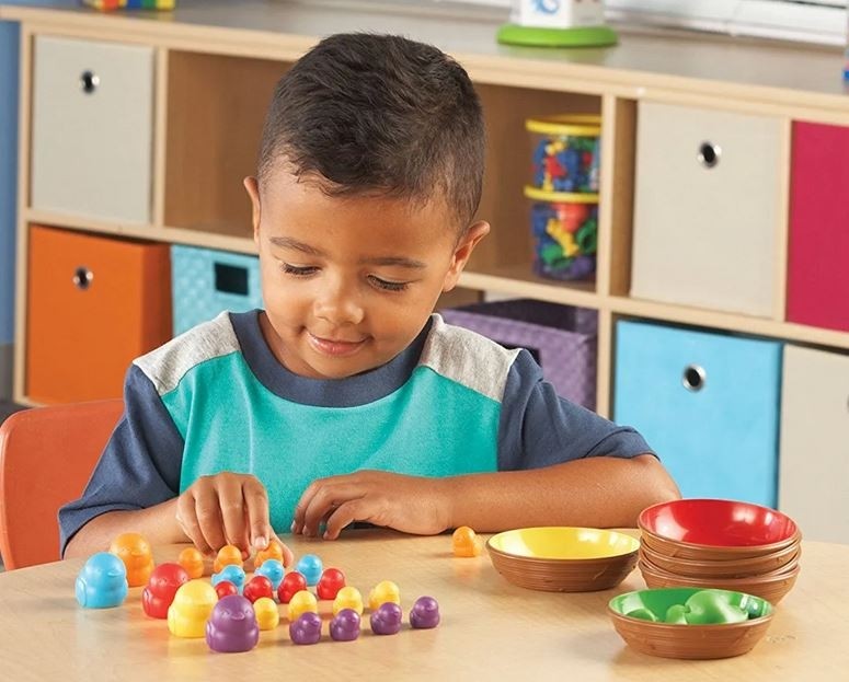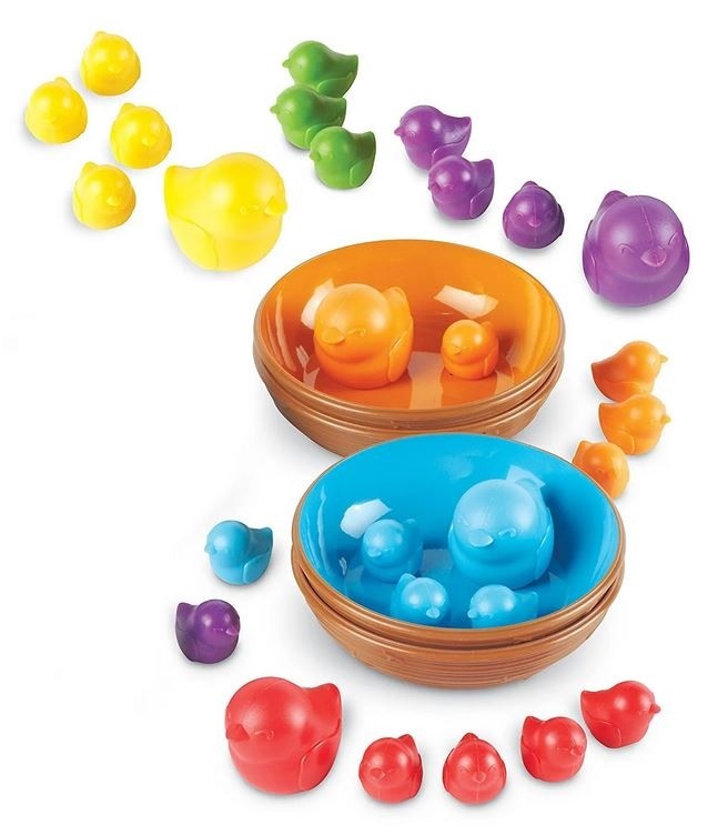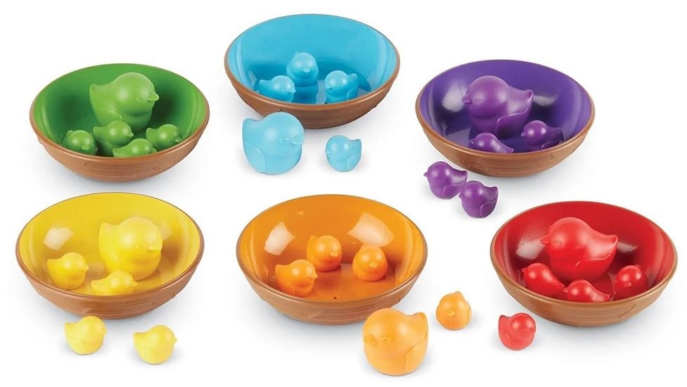Bols de tri colorés en forme de nids avec oiseaux et oisillons pour de nombreux apprentissages :