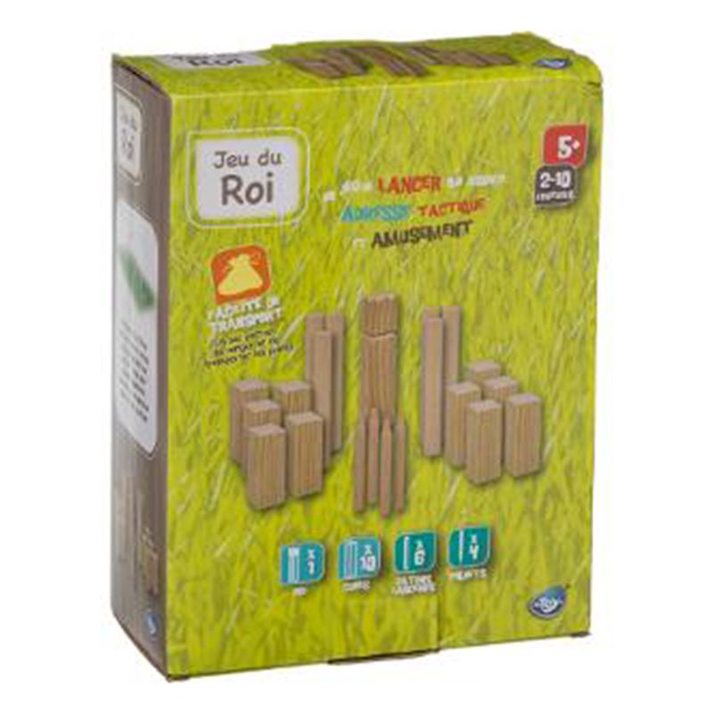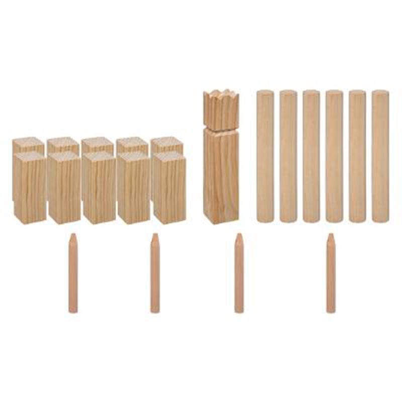 • Contient 21 pièces : 10 Kubbs (les soldats), 1 Roi ( kubb avec une couronne), 6 Bâtons, 4 Pieux (ou marqueurs indiquant les coins du terrain)