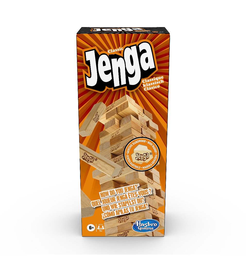 | Plus produit | LE JEU ORIGINAL DE BLOCS EN BOIS À EMPILER : Voici le Jenga classique apprécié des familles depuis des générations. Les joueurs retirent les blocs un à un pour les poser sur le dessus de la tour, sans la faire tomber LA TOUR NE DOIT PAS S\'ÉCROULER : Chaque mouvement compte dans ce jeu de stratégie. Qu\'ils commencent par le bas, le haut ou le milieu de la tour, les joueurs doivent empiler les blocs de manière à maintenir la tour en équilibre POUR 1 JOUEUR OU PLUS : Personne ne veut jouer ? Ce n\'est pas un problème, car le Jenga classique se joue en solo ou en groupe. Ce jeu d\'intérieur simple et amusant est aussi idéal pour faire une pause lorsqu\'on fait l\'école à la maison BLOCS EN BOIS MASSIF VÉRITABLE : Ce jeu Hasbro inclut 54 blocs en bois massif taillés avec précision, et un support pour monter une tour parfaite JEU DE GROUPE CAPTIVANT : Le Jenga égayera toutes les fêtes et soirées de jeux en famille. Ce jeu classique d\'empilage de blocs est facile à jouer et fait un excellent cadeau pour les enfants. À partir de 6 ans |