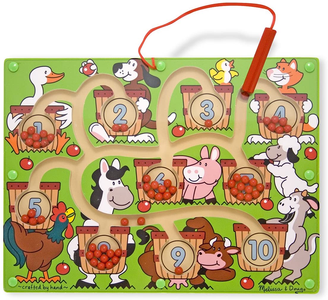 Un pour l'oie et dix pour la chèvre... dans le labyrinthe à baguette magnétique, les animaux comptent sur vous ! Remplissez chaque panier avec le nombre correct de "pommes" rouges en faisant glisser la baguette magnétique attachée sur le couvercle en acrylique. Ensuite, déplacez les pommes dans différentes zones du jeu de labyrinthe pour ajouter, soustraire et faire des mathématiques un jeu d'enfant ! La baguette magnétique est attachée pour qu'elle ne se perde pas; toutes les autres pièces sont enfermées à l'intérieur du labyrinthe, sous le couvercle robuste. Idéal pour voyager !