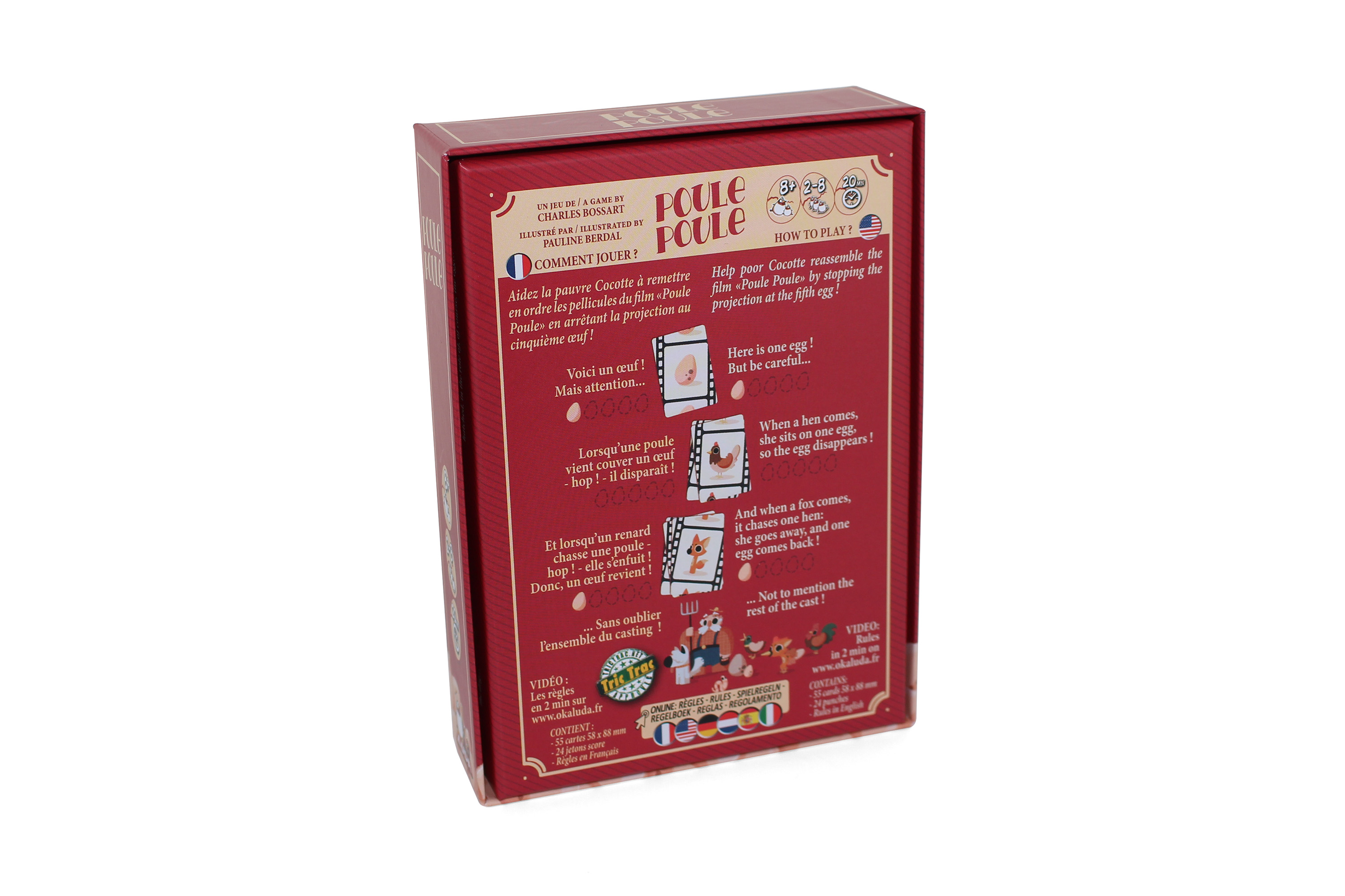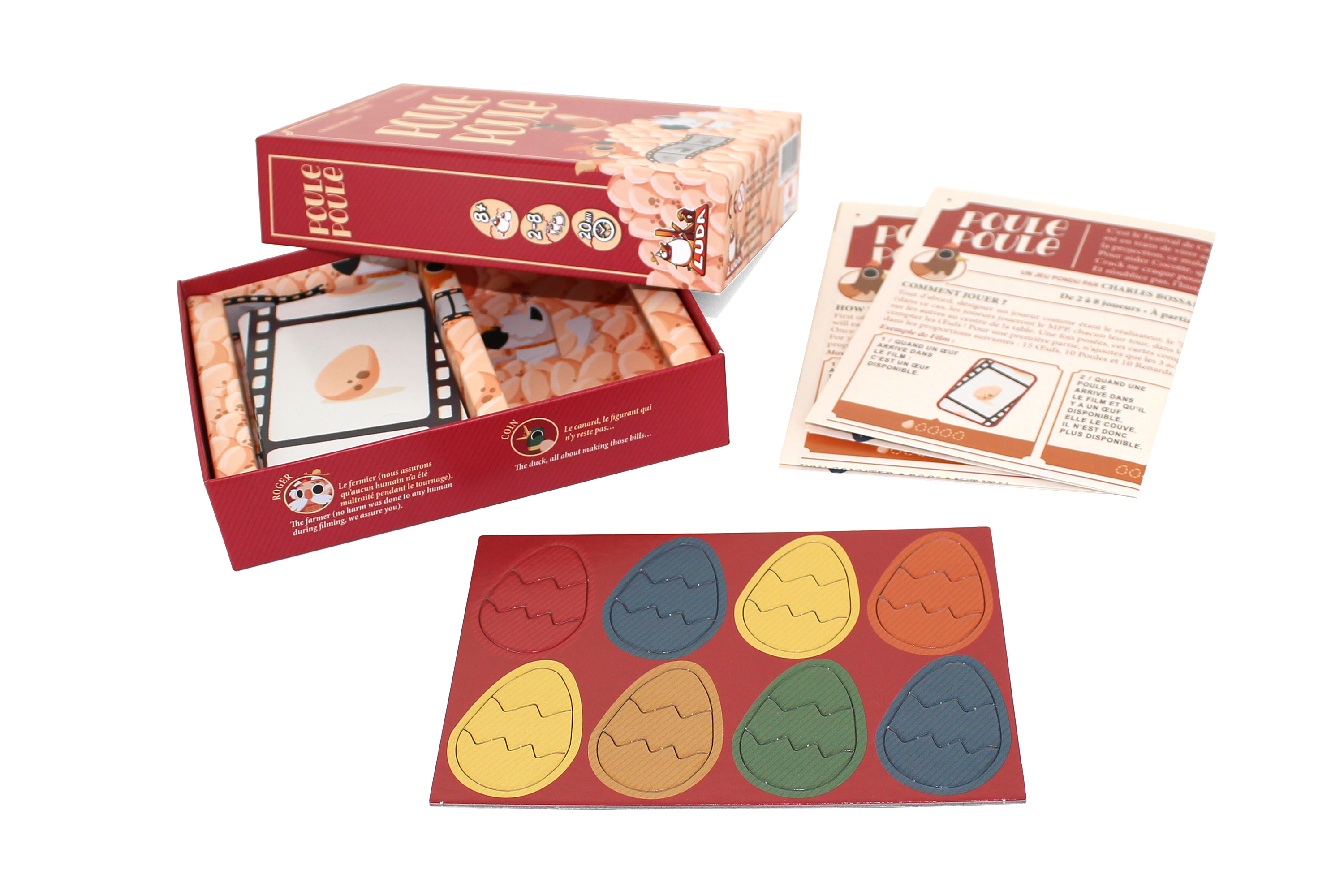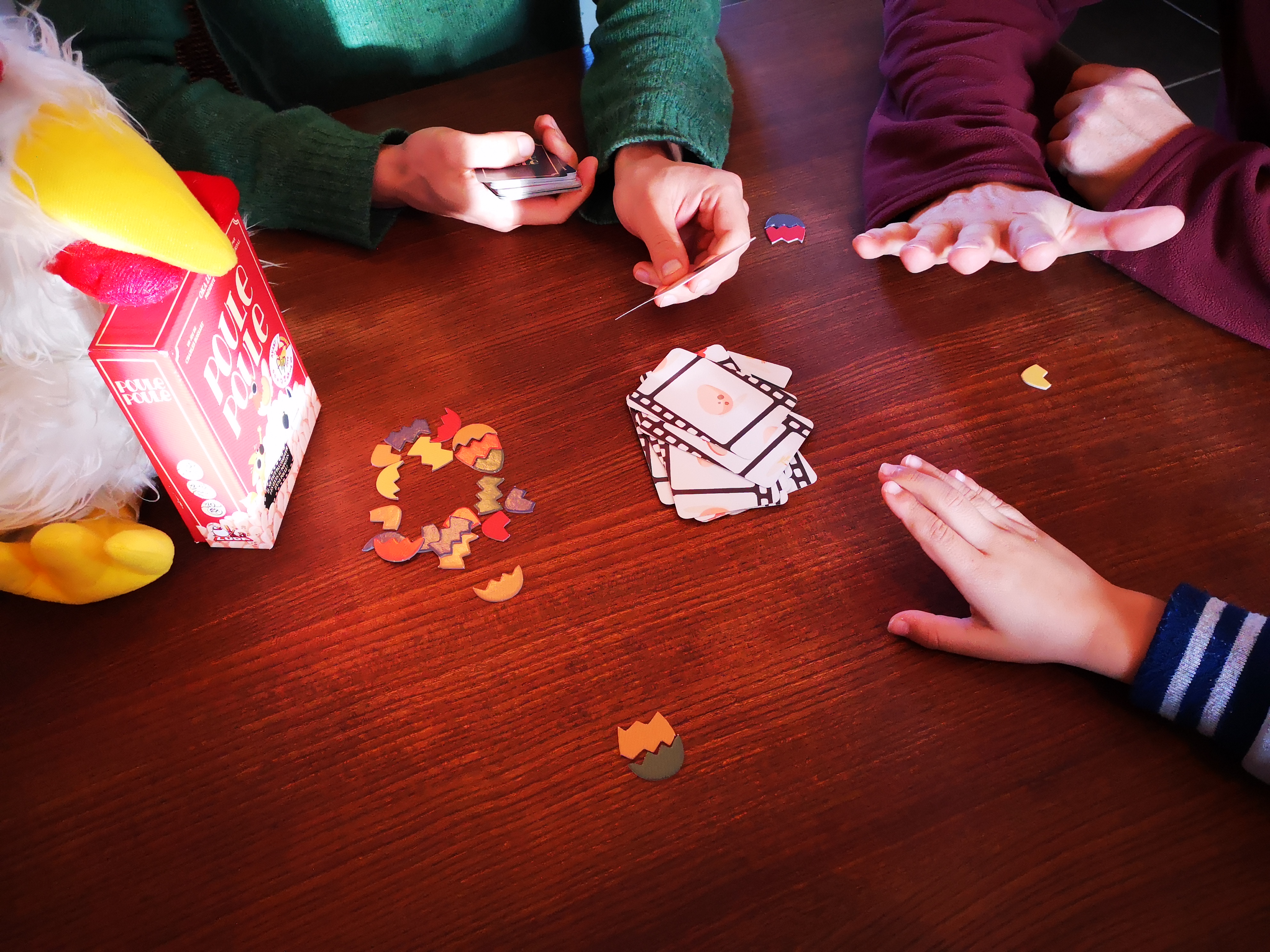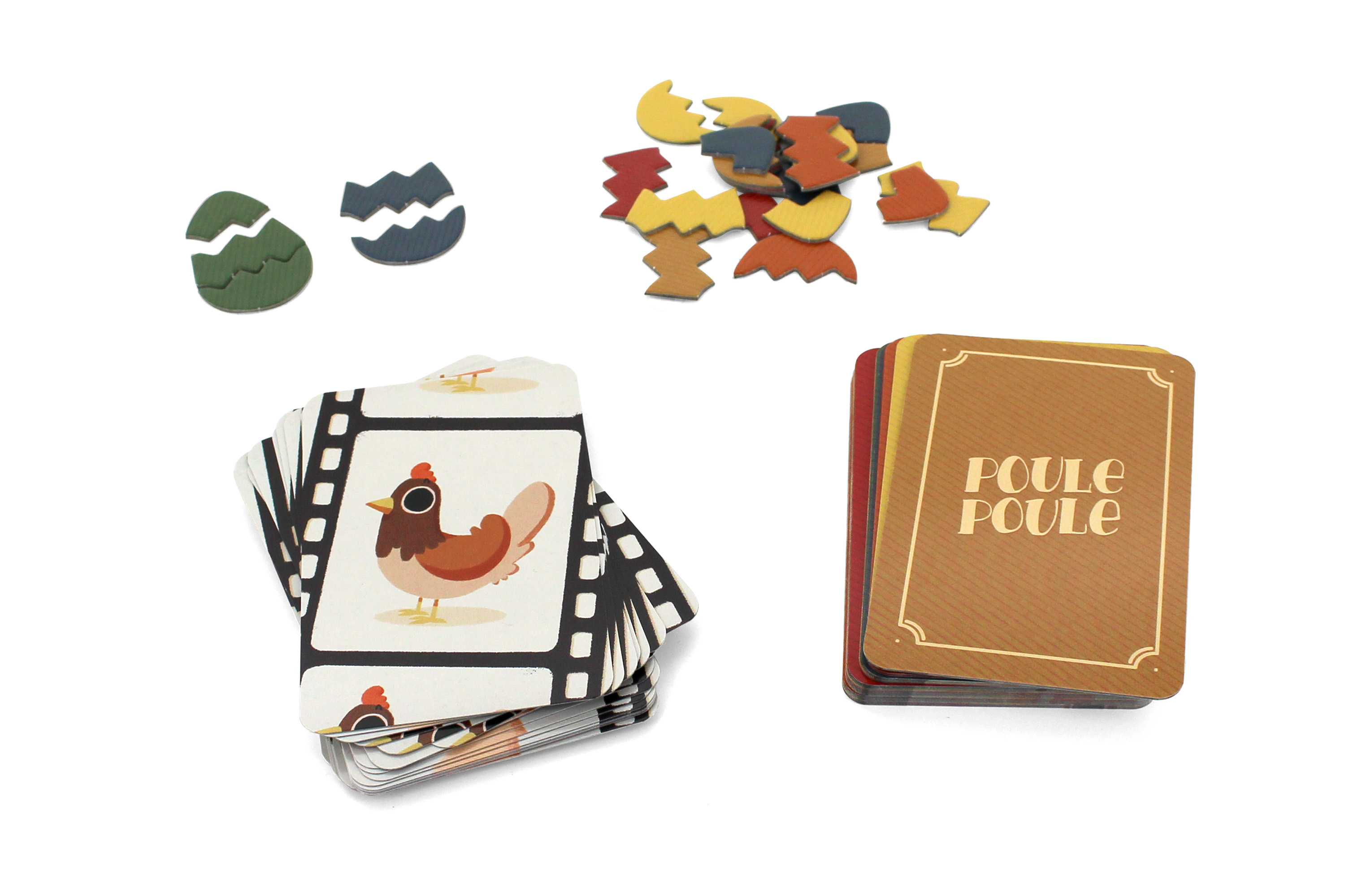 Soyez le premier à taper sur le tas de cartes dès qu'il y a 5 oeufs empilés.. facile ? Détrompez-vous ! Des perturbateurs viennent chambouler votre comptage avec chacun une action particulière qui lui est attribuée : la poule vient couver son oeuf (et donc le rendre indisponible), le renard vient chasser la poule de la basse-cour (l'oeuf redevient disponible). On en parle du renard qui se déguise en poule ?!