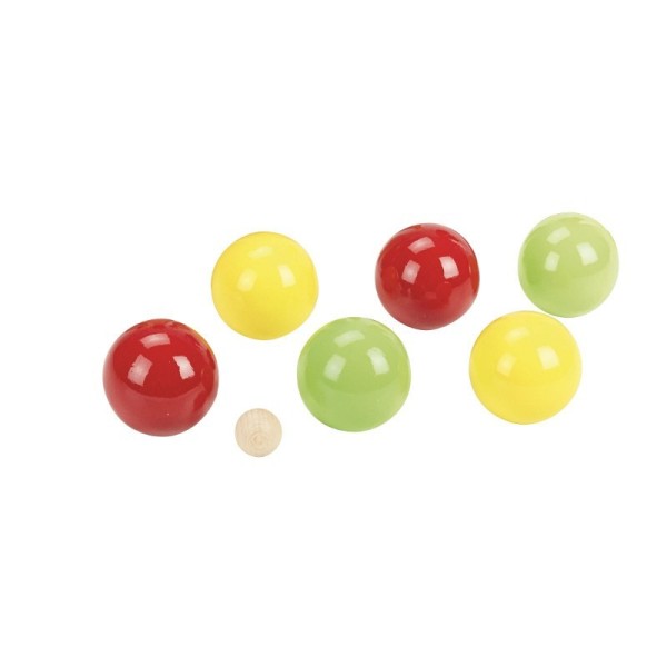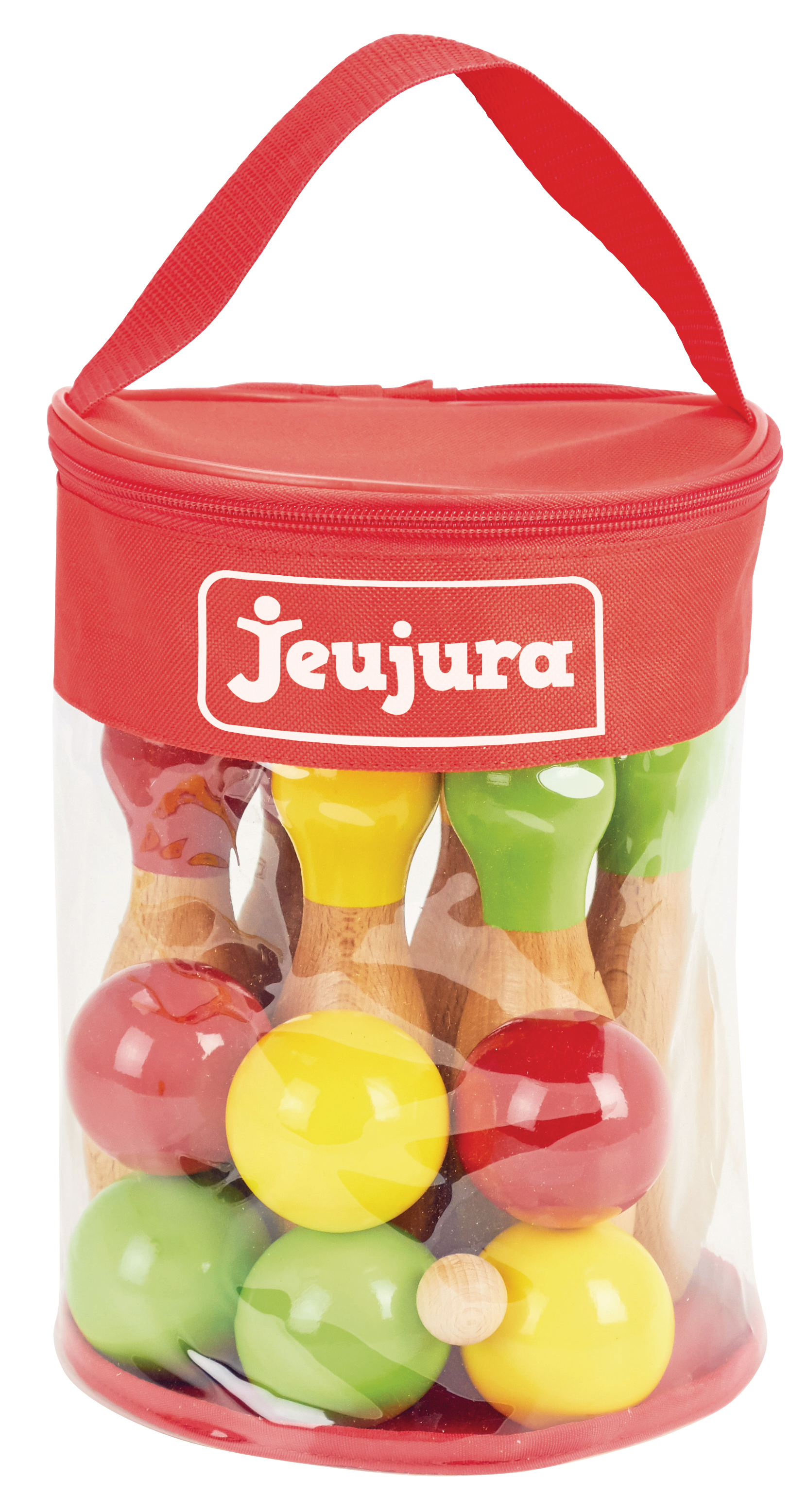 Jeu de Bowling et Jeu de Pétanque en bois, deux grands classiques de jeux de plein air : un jeu de 6 quilles bowling en bois, un jeu de 6 boules de pétanque en bois et un cochonnet, dans un sac de rangement facile à transporter. Dimensions du sac : ht 24 cm – diam : 18 cm. A partir de 3 ans.