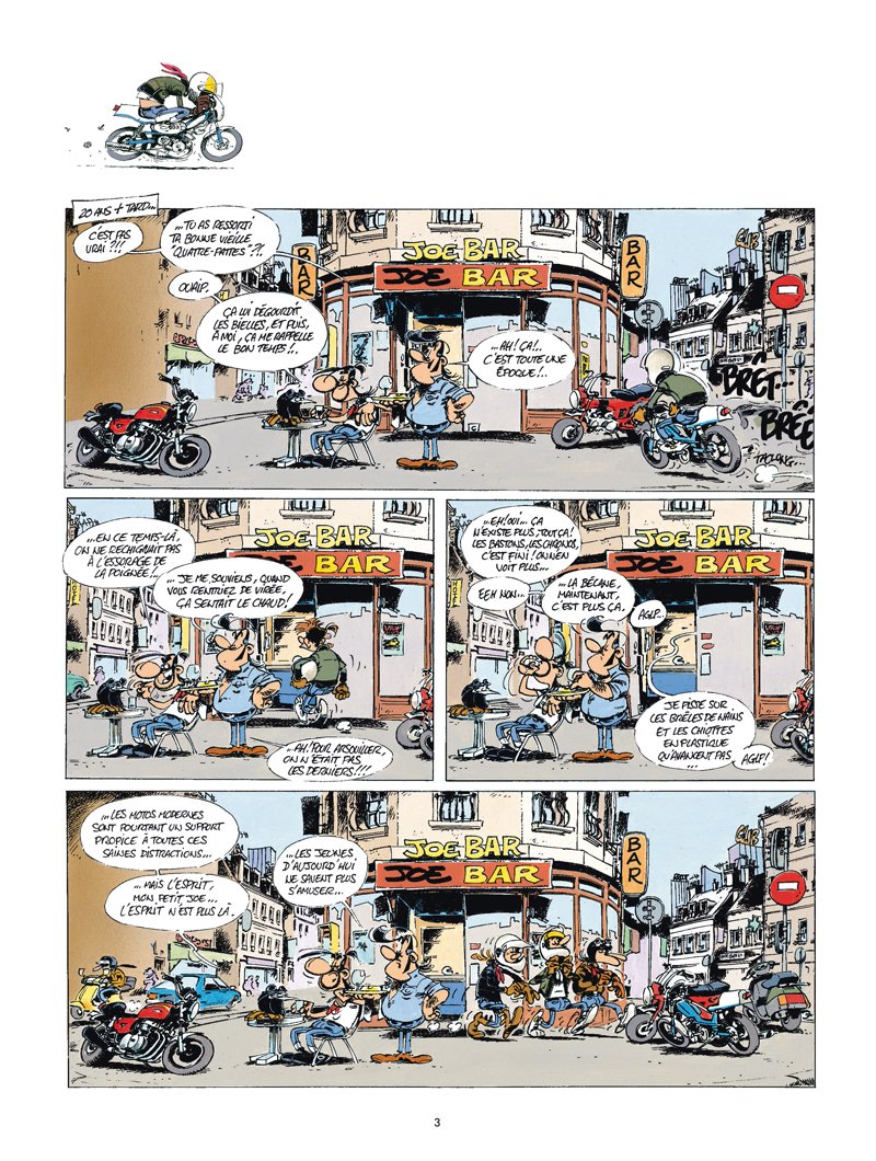 Ils sont 7 cinglés à moto prêts à tout. Champions des tours chronométrés du pâté de maison, ces rois de l'arsouille cumulent les gamelles. Quand ils ne sont pas sur leurs motos, on les retrouve au comptoir du Joe Bar en train de commenter leurs derniers exploits avec une mauvaise foi de rigueur ... Cette BD qui pétarade, sent l'huile bouillie et le radar cramé, est plus qu'un succès phénoménal. Tous les motards en herbe se sont réveillés à la lecture de ces gags pour, à l'unisson, chanter la gloire du Joe Bar Team... refrain repris en coeur par les lecteurs de BD du monde entier.