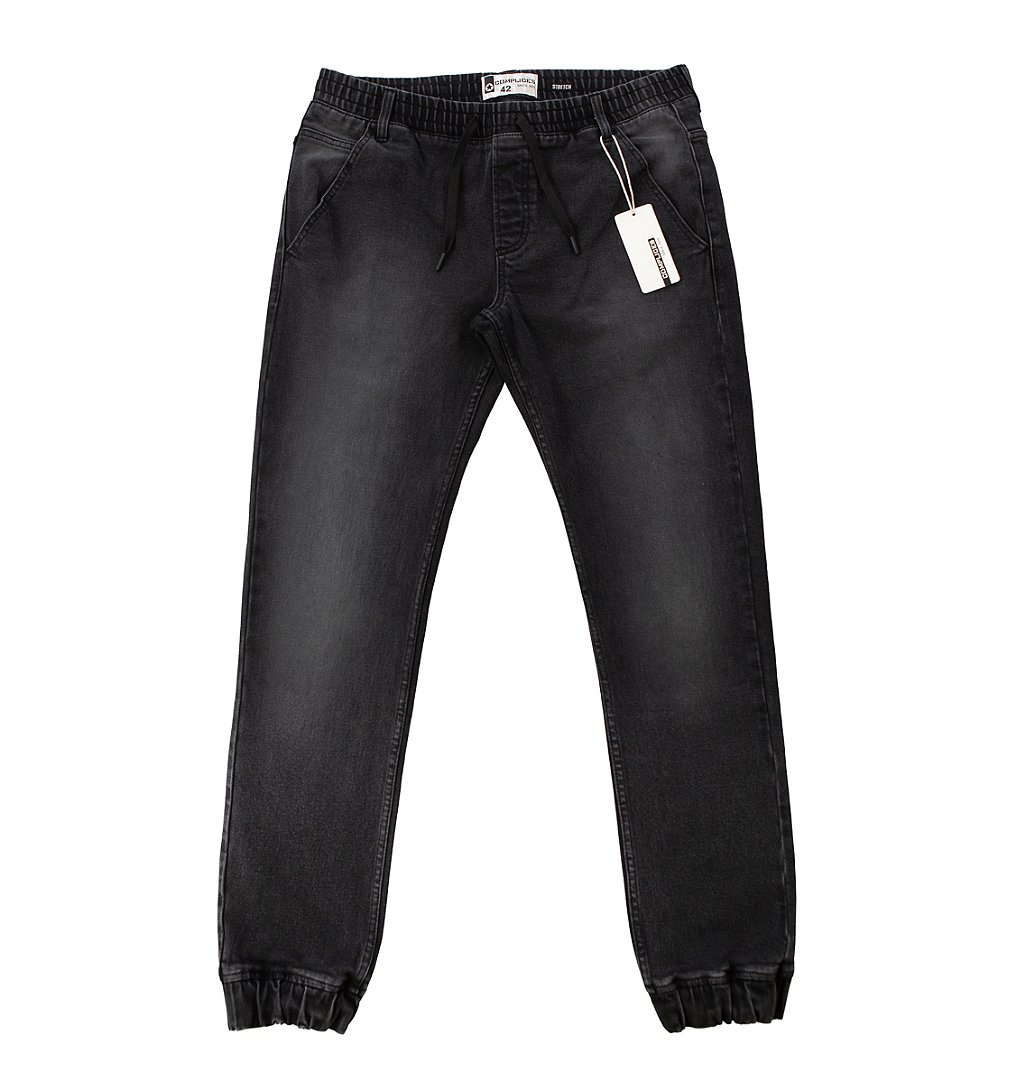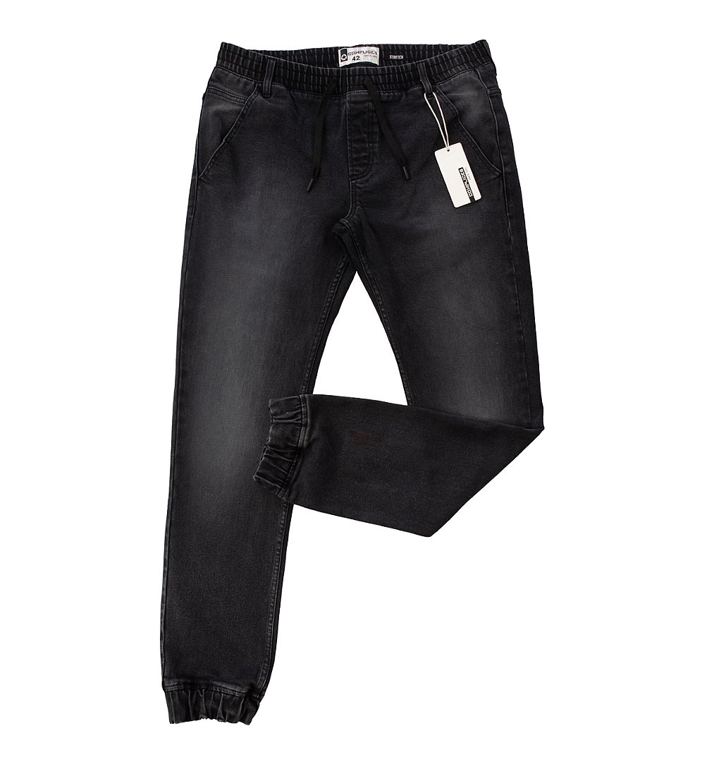 jogger denim homme -stretch- ceinture elastiquée avec cordon -pas de zip -bas elastiqué- 2 etiquettes tissées -2 poches dos-2 poches devant chino -coupe jogger