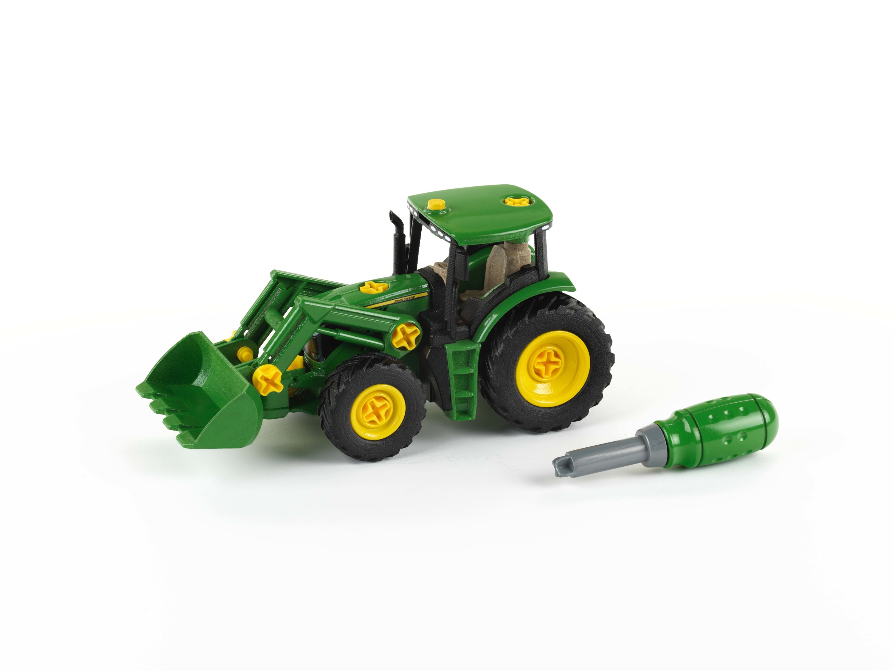 Découvre sans plus attendre ce superbe tracteur à monter JOHN DEERE (échelle 1:24)! Cet engin agricole, équipé d'un chargeur frontal et d'un contrepoids d'équilibrage, est entièrement montable et démontable. A l'aide du tournevis, monte les roues, le siège, la cabine du conducteur, le capot, le chargeur frontal, etc.