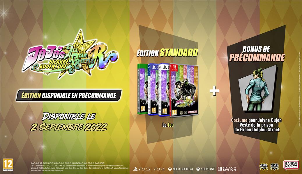 Célèbre pour ses héros charismatiques, son style graphique unique et ses répliques inoubliables (\"Yare yare daze...\"), JoJo's Bizarre Adventure revient sur PlayStation 5, PlayStation 4, Xbox Series X, Xbox One et Nintendo Switch ! Cette année marque le 35ème anniversaire de l'histoire originale et le 10ème anniversaire de l'anime. 50 personnages jouables issus de tous les arcs de l'histoire originale. Jonathan Joestar, Jotaro Kujo, DIO, Jolyne Cujoh et bien d'autres personnages se réunissent sur plusieurs générations de JoJo's Bizarre Adventure ! Avec 50 personnages jouables provenant de tous les arcs, vous pouvez revivre les combats populaires de chaque histoire et voir des personnages issus de différents univers interagir pour la première fois ! Des graphismes ultra fidèles au style de l'auteur. JoJo's Bizarre Adventure: All-Star Battle R parvient à retranscrire les expressions faciales typiques de JoJo qui vous donneront l'impression que le manga prend vie sous vos yeux.