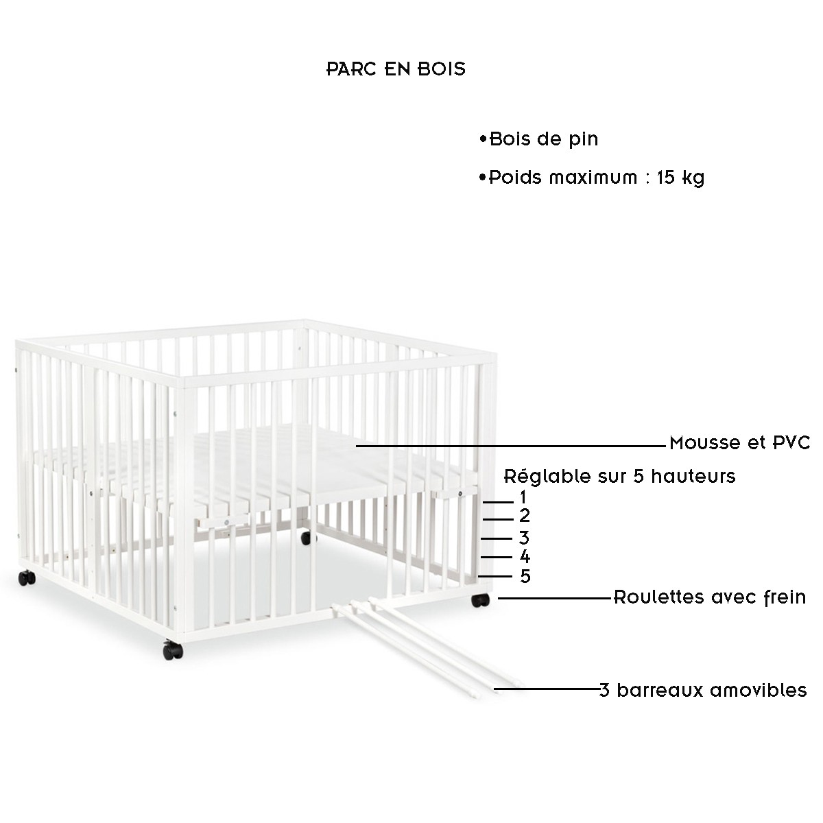 | Plus produit | Parc bébé en bois de pin pour enfant de la naissance jusqu'à 2 ans. Poids maximum : 15 kg. |