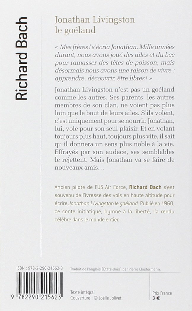 "Mes frères ! s'écria Jonathan. Mille années durant, nous avons joué des ailes et du bec pour ramasser des têtes de poisson, mais désormais nous avons une raison de vivre : apprendre, découvrir, être libres !" Jonathan Livingston n'est pas un goéland comme les autres. Ses parents, les autres membres de son clan, ne voient pas plus loin que le bout de leurs ailes. S'ils volent, c'est uniquement pour se nourrir.Jonathan, lui, vole pour son seul plaisir. Et en volant toujours plus haut, toujours plus vite, il sait qu'il découvrira un sens plus noble à la vie. Effrayés par son audace, ses semblables le rejettent. Mais Jonathan va se faire de nouveaux amis...